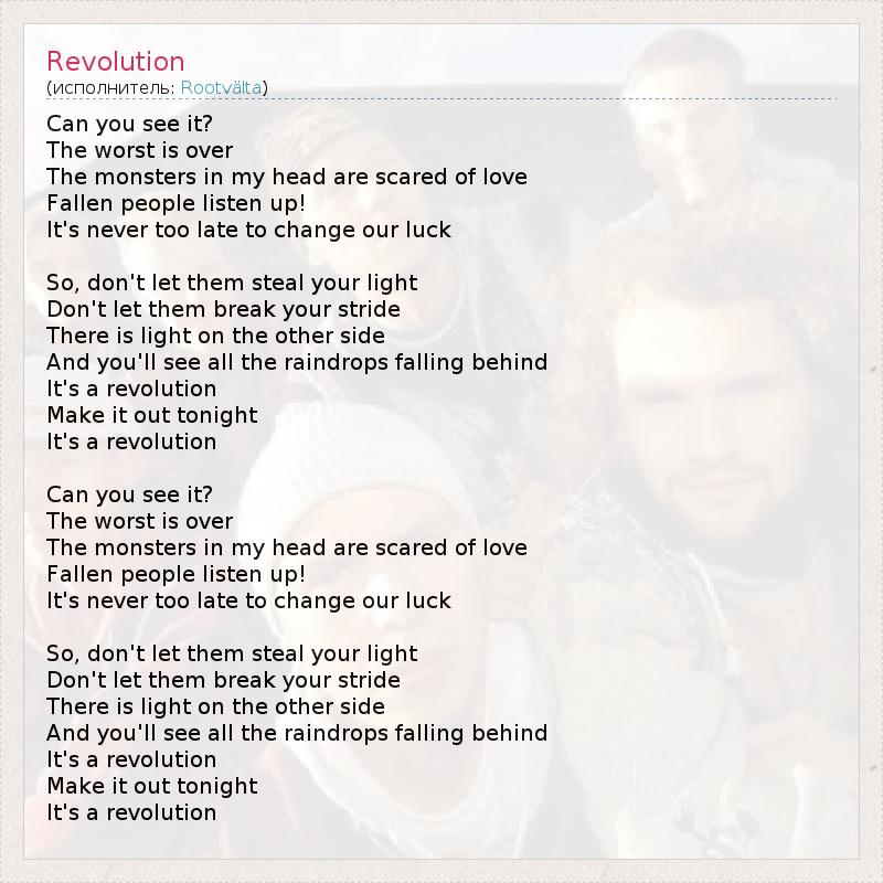 Вы видите? Худшее уже позади. Монстры в моей голове боятся любви. Слушайте, падшие люди! Никогда не поздно изменить нашу судьбу. Поэтому не дайте поглотить ваш свет. Не дайте помешать вам идти вперед. На той стороне есть свет, И вы увидите все капли дождя, падающие у вас за спиной. Это революция. Поймите это сегодня ночью. Это революция. Вы видите? Худшее уже позади. Монстры в моей голове боятся любви. Слушайте, падшие люди! Никогда не поздно изменить нашу судьбу. Поэтому не дайте поглотить ваш свет. Не дайте помешать вам идти вперед. На той стороне есть свет, И вы увидите все капли дождя, падающие у вас за спиной. Это революция. Поймите это сегодня ночью. Это революция.