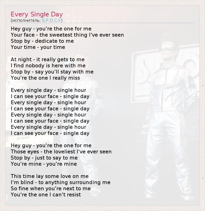 Малыш, ты мой самый любимый. Ты просто симпатяшка – я таких не встречала. Загляни ко мне, удели мне Немного времени. Ночью меня терзает мысль, Что никого нет рядом. Загляни ко мне, скажи, что останешься со мной. Я скучаю по тебе одному. Каждый день, каждый час… Я думаю о тебе каждый день. Каждый день, каждый час… Я думаю о тебе каждый день. Каждый день, каждый час… Я думаю о тебе каждый день. Каждый день, каждый час… Я думаю о тебе каждый день. Малыш, ты мой самый любимый. Я ни у кого не видела таких прекрасных глаз. Загляни ко мне, чтобы сказать, Что ты мой, что ты мой. Подари мне немного любви хоть на этот раз. Я ослепла – не замечаю ничего вокруг. Я на седьмом небе, когда ты рядом. Я не могу устоять перед тобой.