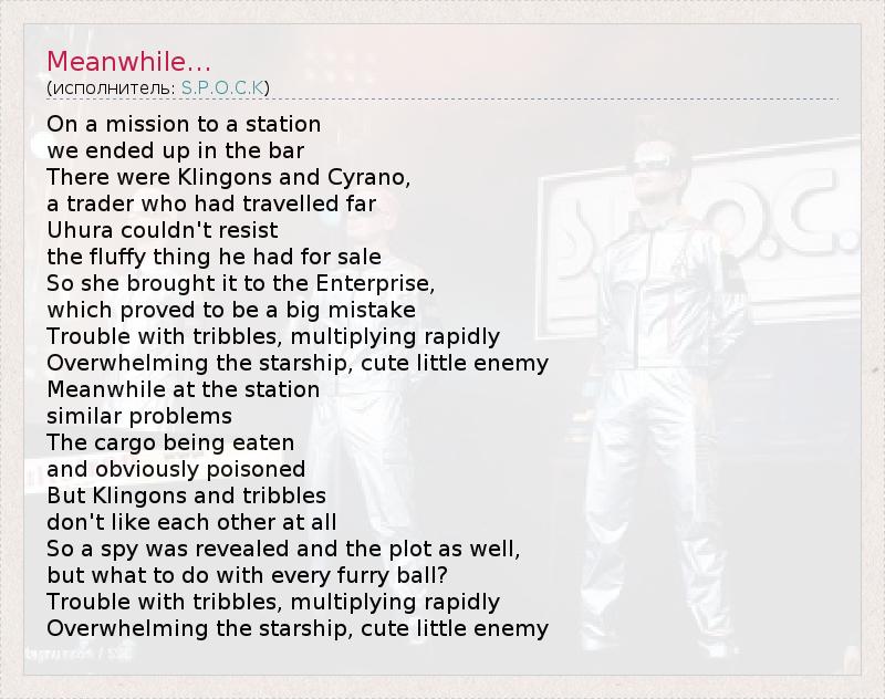 On a mission to a station we ended up in the bar There were Klingons and Cyrano, a trader who had travelled far Uhura couldn't resist the fluffy thing he had for sale So she brought it to the Enterprise, which proved to be a big mistake Trouble with tribbles, multiplying rapidly Overwhelming the starship, cute little enemy Meanwhile at the station similar problems The cargo being eaten and obviously poisoned But Klingons and tribbles don't like each other at all So a spy was revealed and the plot as well, but what to do with every furry ball? Trouble with tribbles, multiplying rapidly Overwhelming the starship, cute little enemy