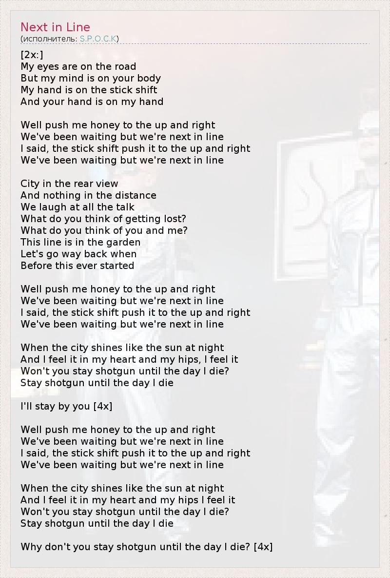 [2x:] Мои глаза глядят на дорогу, Но в моих мыслях твое тело. Моя рука на рычаге скоростей, 1 Твоя рука на моей. Подтолкни меня, милая – вверх и вправо; Мы ждали, но мы следующие в очереди. Давай же, подтолкни рычаг вверх и вправо; Мы ждали, но мы следующие в очереди. Город в боковом зеркале, И ничего в дали. Мы хохочем, разговаривая. Что если нам затеряться? Что ты думаешь о нас с тобой? Эта очередь в райский сад. 2 Давай вернемся во времена, когда Еще ничего не было. Подтолкни меня, милая – вверх и вправо; Мы ждали, но мы следующие в очереди. Давай же, подтолкни рычаг вверх и вправо; Мы ждали, но мы следующие в очереди. Когда город сияет как солнце в ночи, Я чувствую его сердцем, чувствую всем телом. Прошу, останься попутчицей 3 до самого конца. 4 Останься попутчицей до самого конца. Я останусь рядом [4x] Подтолкни меня, милая – вверх и вправо; Мы ждали, но мы следующие в очереди. Давай же, подтолкни рычаг вверх и вправо; Мы ждали, но мы следующие в очереди. Когда город сияет как солнце в ночи, Я чувствую его сердцем, чувствую всем телом. Прошу, останься попутчицей до самого конца. Останься попутчицей до самого конца. Почему бы тебе не остаться попутчицей до самого конца? [4x] 1 - stick shift – рычаг переключения скоростей в машине 2 - garden – вероятно, имеется в виду райский сад Эдем. С изгнания Адама и Евы из него начался наш мир. Отсюда две последующие строки: "Давай вернемся во времена, когда еще ничего не началось", т.е. во времена рая. 3 - shotgun – пассажир или место справа от водителя. Пошло со времен Дикого Запада, когда для защиты рядом с возницей сидел человек с ружьем. 4 - дословно: пока я не умру
