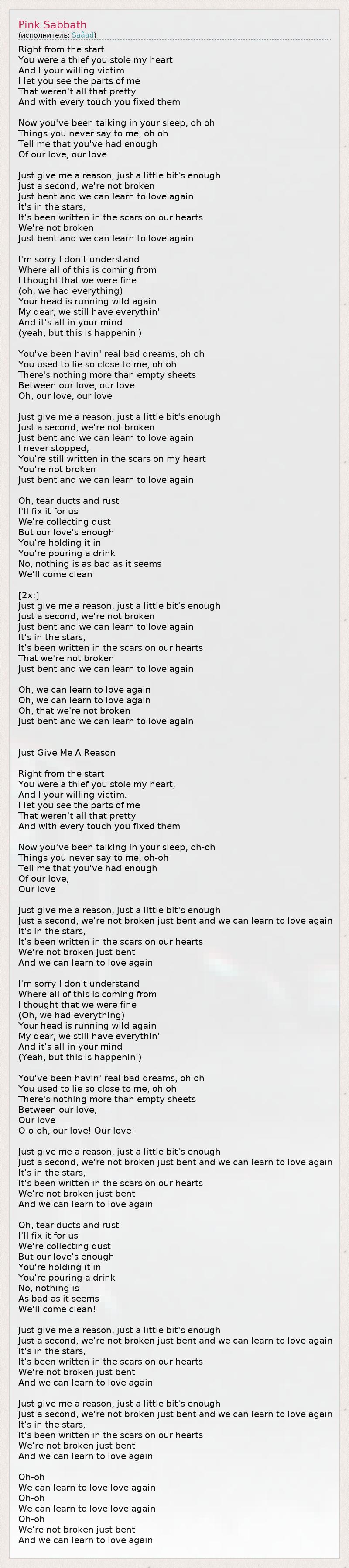 Right from the start You were a thief you stole my heart And I your willing victim I let you see the parts of me That weren't all that pretty And with every touch you fixed them Now you've been talking in your sleep, oh oh Things you never say to me, oh oh Tell me that you've had enough Of our love, our love Just give me a reason, just a little bit's enough Just a second, we're not broken Just bent and we can learn to love again It's in the stars, It's been written in the scars on our hearts We're not broken Just bent and we can learn to love again I'm sorry I don't understand Where all of this is coming from I thought that we were fine (oh, we had everything) Your head is running wild again My dear, we still have everythin' And it's all in your mind (yeah, but this is happenin') You've been havin' real bad dreams, oh oh You used to lie so close to me, oh oh There's nothing more than empty sheets Between our love, our love Oh, our love, our love Just give me a reason, just a little bit's enough Just a second, we're not broken Just bent and we can learn to love again I never stopped, You're still written in the scars on my heart You're not broken Just bent and we can learn to love again Oh, tear ducts and rust I'll fix it for us We're collecting dust But our love's enough You're holding it in You're pouring a drink No, nothing is as bad as it seems We'll come clean [2x:] Just give me a reason, just a little bit's enough Just a second, we're not broken Just bent and we can learn to love again It's in the stars, It's been written in the scars on our hearts That we're not broken Just bent and we can learn to love again Oh, we can learn to love again Oh, we can learn to love again Oh, that we're not broken Just bent and we can learn to love again Just Give Me A Reason Right from the start You were a thief you stole my heart, And I your willing victim. I let you see the parts of me That weren't all that pretty And with every touch you fixed them Now you've been talking in your sleep, oh-oh Things you never say to me, oh-oh Tell me that you've had enough Of our love, Our love Just give me a reason, just a little bit's enough Just a second, we're not broken just bent and we can learn to love again It's in the stars, It's been written in the scars on our hearts We're not broken just bent And we can learn to love again I'm sorry I don't understand Where all of this is coming from I thought that we were fine (Oh, we had everything) Your head is running wild again My dear, we still have everythin' And it's all in your mind (Yeah, but this is happenin') You've been havin' real bad dreams, oh oh You used to lie so close to me, oh oh There's nothing more than empty sheets Between our love, Our love O-o-oh, our love! Our love! Just give me a reason, just a little bit's enough Just a second, we're not broken just bent and we can learn to love again It's in the stars, It's been written in the scars on our hearts We're not broken just bent And we can learn to love again Oh, tear ducts and rust I'll fix it for us We're collecting dust But our love's enough You're holding it in You're pouring a drink No, nothing is As bad as it seems We'll come clean! Just give me a reason, just a little bit's enough Just a second, we're not broken just bent and we can learn to love again It's in the stars, It's been written in the scars on our hearts We're not broken just bent And we can learn to love again Just give me a reason, just a little bit's enough Just a second, we're not broken just bent and we can learn to love again It's in the stars, It's been written in the scars on our hearts We're not broken just bent And we can learn to love again Oh-oh We can learn to love love again Oh-oh We can learn to love love again Oh-oh We're not broken just bent And we can learn to love again