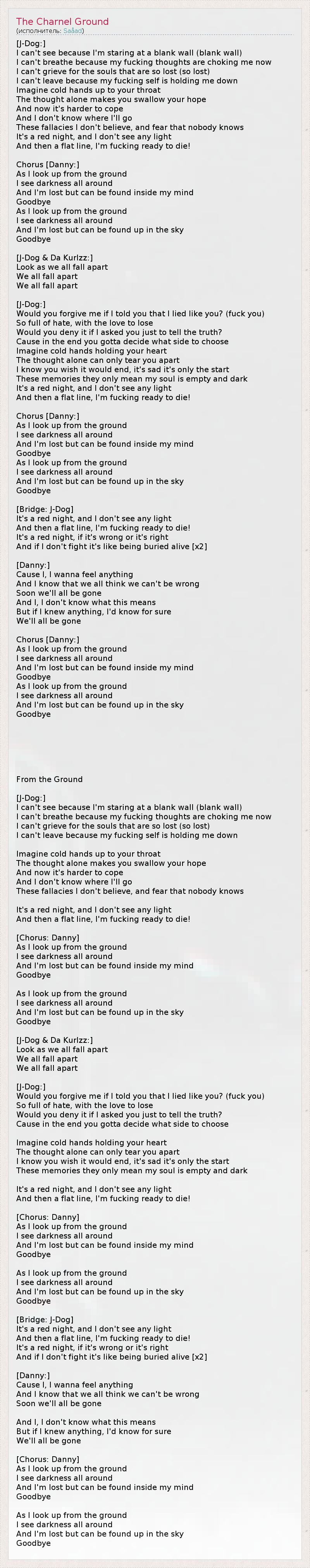 [J-Dog:] Я ни черта не вижу, потому что уставился на пустую стену (пустую стену), Я не могу дышать, потому что мои греб*ные мысли душат меня, Я не могу горевать о потерянных душах (таких потерянных), Я не могу уйти, потому что моё собственное "я" меня сдерживает! Представь себе холодные руки, которые тянутся к твоему горлу - От одной этой мысли все надежды застревают комком в горле. 1 Теперь с этим все труднее справиться... Я не знаю, куда мне идти. В эти заблуждения я не верю и, боюсь, никто не знает, Что это кровавая ночь. Я не вижу никакого света, А затем - ровная линия... 2 Теперь я, бл*дь, готов умереть! [Припев: Danny:] Когда я выглядываю из-под земли, Я вижу только темноту вокруг. Я потерялся, но меня всё ещё можно найти - в моей голове. Прощай... Когда я выглядываю из-под земли, Я вижу только темноту вокруг. Я потерялся, но меня можно найти на небесах. Прощай... [J-Dog & Da Kurlzz:] Смотри, как мы все погибаем... Мы все погибаем... Мы все погибаем... [J-Dog:] Простишь меня, если я скажу, что лгал, как ты? (пошел нах!) Я переполнен ненавистью, но у меня все еще есть любовь, которую можно потерять. Ты бы стал все отрицать, если бы я попросил тебя сказать правду? Потому что в конце концов ты должен выбрать, на чью сторону встать. Представь себе холодные руки, которые держат твое сердце - Одна только мысль об этом разорвет тебя на части. Я знаю, ты хочешь, чтобы все кончилось, но к сожалению, это только начало. Эти воспоминания только доказывают, что в моей душе темно и пусто. Это кровавая ночь, и я не вижу никакого света! А затем - ровная линия... Теперь я, бл*дь, готов умереть! [Припев: Danny:] Когда я выглядываю из-под земли, Я вижу только темноту вокруг. Я потерялся, но меня всё ещё можно найти - в моей голове. Прощай... Когда я выглядываю из-под земли, Я вижу только темноту вокруг. Я потерялся, но меня можно найти на небесах. Прощай... [Переход: J-Dog:] Это кровавая ночь, и я не вижу никакого света! А затем - ровная линия... Теперь я, бл*дь, готов умереть! Это кровавая ночь, правильно это или нет, Не бороться - всё равно что быть похороненным заживо [x2] [Danny:] Потому что я, я хочу почувствовать хоть что-нибудь, И я знаю, все мы думаем, что не можем ошибаться, Но скоро нам всем придет конец... И я, я не знаю, что это значит, Но если бы я хоть что-нибудь понимал, я бы точно знал, Нам всем конец... [Припев: Danny:] Когда я выглядываю из-под земли, Я вижу только темноту вокруг. Я потерялся, но меня всё ещё можно найти - в моей голове. Прощай... Когда я выглядываю из-под земли, Я вижу только темноту вокруг. Я потерялся, но меня можно найти на небесах. Прощай... 1 - дословно: проглатываешь, поглощаешь 2 - имеется в виду индикатор сердцебиения Из-под земли* (перевод Rustaveli из Обухова) [J-Dog:] Я ничего не вижу, потому что передо мной стена Я не могу дышать, потому что давит на меня она Я не могу грустить, о душах тех, кого потерял Я не могу уйти отсюда, потому что здесь застрял Представьте на мгновенье, на вашем горле холодные руки И только Вы способны понять, одиночества муки И все сложнее с этим справляться Запутался я, куда направляться? Боюсь я того, что могу среди толпы затеряться Это красная ночь, и не видно проблесков света И я готов умереть, потому что выбора нету! [Припев: Danny] Из под земли, осматриваю все вокруг Я вижу только темноту, мой друг Меня можно найти в своей голове, всегда знай Прощай! Из под земли, осматриваю все вокруг Я вижу только темноту, мой друг