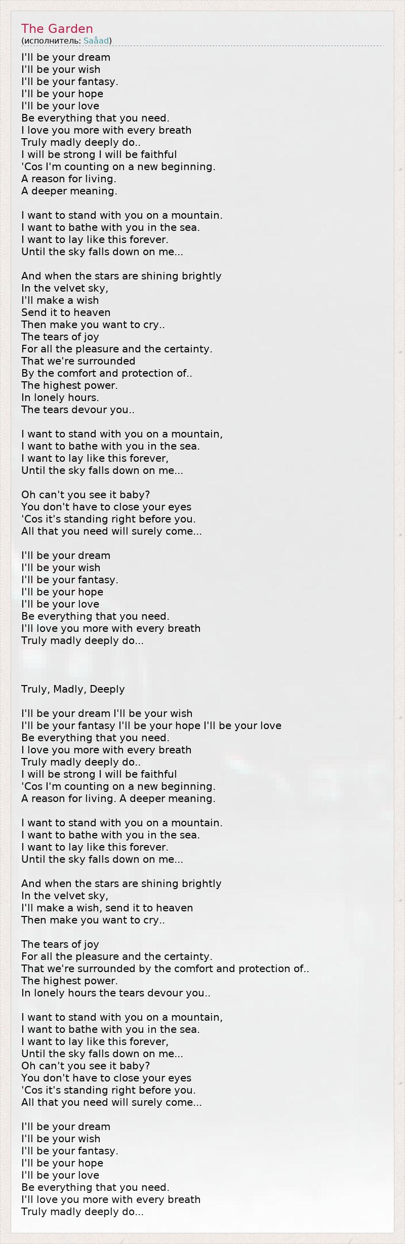 I'll be your dream I'll be your wish I'll be your fantasy. I'll be your hope I'll be your love Be everything that you need. I love you more with every breath Truly madly deeply do.. I will be strong I will be faithful 'Cos I'm counting on a new beginning. A reason for living. A deeper meaning. I want to stand with you on a mountain. I want to bathe with you in the sea. I want to lay like this forever. Until the sky falls down on me... And when the stars are shining brightly In the velvet sky, I'll make a wish Send it to heaven Then make you want to cry.. The tears of joy For all the pleasure and the certainty. That we're surrounded By the comfort and protection of.. The highest power. In lonely hours. The tears devour you.. I want to stand with you on a mountain, I want to bathe with you in the sea. I want to lay like this forever, Until the sky falls down on me... Oh can't you see it baby? You don't have to close your eyes 'Cos it's standing right before you. All that you need will surely come... I'll be your dream I'll be your wish I'll be your fantasy. I'll be your hope I'll be your love Be everything that you need. I'll love you more with every breath Truly madly deeply do... Truly, Madly, Deeply I'll be your dream I'll be your wish I'll be your fantasy I'll be your hope I'll be your love Be everything that you need. I love you more with every breath Truly madly deeply do.. I will be strong I will be faithful 'Cos I'm counting on a new beginning. A reason for living. A deeper meaning. I want to stand with you on a mountain. I want to bathe with you in the sea. I want to lay like this forever. Until the sky falls down on me... And when the stars are shining brightly In the velvet sky, I'll make a wish, send it to heaven Then make you want to cry.. The tears of joy For all the pleasure and the certainty. That we're surrounded by the comfort and protection of.. The highest power. In lonely hours the tears devour you.. I want to stand with you on a mountain, I want to bathe with you in the sea. I want to lay like this forever, Until the sky falls down on me... Oh can't you see it baby? You don't have to close your eyes 'Cos it's standing right before you. All that you need will surely come... I'll be your dream I'll be your wish I'll be your fantasy. I'll be your hope I'll be your love Be everything that you need. I'll love you more with every breath Truly madly deeply do...