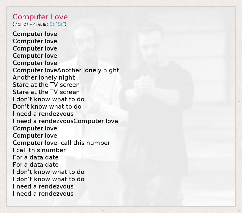 Computer love Computer love Computer love Computer love Computer love Computer loveAnother lonely night Another lonely night Stare at the TV screen Stare at the TV screen I don't know what to do Don't know what to do I need a rendezvous I need a rendezvousComputer love Computer love Computer love Computer loveI call this number I call this number For a data date For a data date I don't know what to do I don't know what to do I need a rendezvous I need a rendezvous