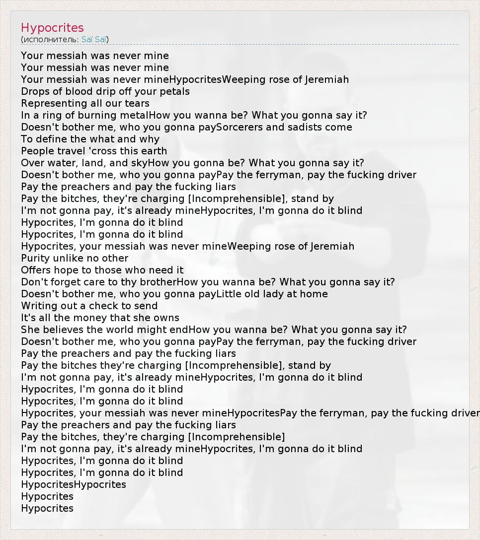 Your messiah was never mine Your messiah was never mine Your messiah was never mineHypocritesWeeping rose of Jeremiah Drops of blood drip off your petals Representing all our tears In a ring of burning metalHow you wanna be? What you gonna say it? Doesn't bother me, who you gonna paySorcerers and sadists come To define the what and why People travel 'cross this earth Over water, land, and skyHow you gonna be? What you gonna say it? Doesn't bother me, who you gonna payPay the ferryman, pay the fucking driver Pay the preachers and pay the fucking liars Pay the bitches, they're charging [Incomprehensible], stand by I'm not gonna pay, it's already mineHypocrites, I'm gonna do it blind Hypocrites, I'm gonna do it blind Hypocrites, I'm gonna do it blind Hypocrites, your messiah was never mineWeeping rose of Jeremiah Purity unlike no other Offers hope to those who need it Don't forget care to thy brotherHow you wanna be? What you gonna say it? Doesn't bother me, who you gonna payLittle old lady at home Writing out a check to send It's all the money that she owns She believes the world might endHow you wanna be? What you gonna say it? Doesn't bother me, who you gonna payPay the ferryman, pay the fucking driver Pay the preachers and pay the fucking liars Pay the bitches they're charging [Incomprehensible], stand by I'm not gonna pay, it's already mineHypocrites, I'm gonna do it blind Hypocrites, I'm gonna do it blind Hypocrites, I'm gonna do it blind Hypocrites, your messiah was never mineHypocritesPay the ferryman, pay the fucking driver Pay the preachers and pay the fucking liars Pay the bitches, they're charging [Incomprehensible] I'm not gonna pay, it's already mineHypocrites, I'm gonna do it blind Hypocrites, I'm gonna do it blind Hypocrites, I'm gonna do it blind HypocritesHypocrites Hypocrites Hypocrites