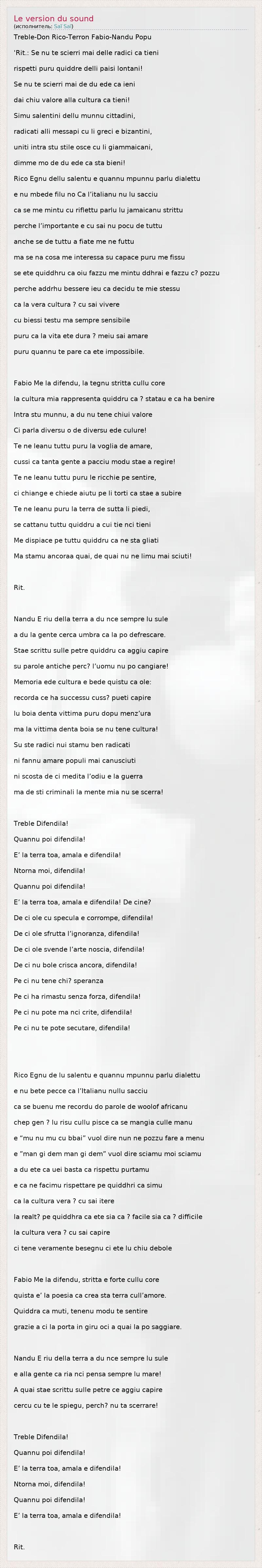 Treble-Don Rico-Terron Fabio-Nandu Popu 'Rit.: Se nu te scierri mai delle radici ca tieni rispetti puru quiddre delli paisi lontani! Se nu te scierri mai de du ede ca ieni dai chiu valore alla cultura ca tieni! Simu salentini dellu munnu cittadini, radicati alli messapi cu li greci e bizantini, uniti intra stu stile osce cu li giammaicani, dimme mo de du ede ca sta bieni! Rico Egnu dellu salentu e quannu mpunnu parlu dialettu e nu mbede filu no Ca l’italianu nu lu sacciu ca se me mintu cu riflettu parlu lu jamaicanu strittu perche l’importante e cu sai nu pocu de tuttu anche se de tuttu a fiate me ne futtu ma se na cosa me interessa su capace puru me fissu se ete quiddhru ca oiu fazzu me mintu ddhrai e fazzu c? pozzu perche addrhu bessere ieu ca decidu te mie stessu ca la vera cultura ? cu sai vivere cu biessi testu ma sempre sensibile puru ca la vita ete dura ? meiu sai amare puru quannu te pare ca ete impossibile. Fabio Me la difendu, la tegnu stritta cullu core la cultura mia rappresenta quiddru ca ? statau e ca ha benire Intra stu munnu, a du nu tene chiui valore Ci parla diversu o de diversu ede culure! Te ne leanu tuttu puru la voglia de amare, cussi ca tanta gente a pacciu modu stae a regire! Te ne leanu tuttu puru le ricchie pe sentire, ci chiange e chiede aiutu pe li torti ca stae a subire Te ne leanu puru la terra de sutta li piedi, se cattanu tuttu quiddru a cui tie nci tieni Me dispiace pe tuttu quiddru ca ne sta gliati Ma stamu ancoraa quai, de quai nu ne limu mai sciuti! Rit. Nandu E riu della terra a du nce sempre lu sule a du la gente cerca umbra ca la po defrescare. Stae scrittu sulle petre quiddru ca aggiu capire su parole antiche perc? l’uomu nu po cangiare! Memoria ede cultura e bede quistu ca ole: recorda ce ha successu cuss? pueti capire lu boia denta vittima puru dopu menz’ura ma la vittima denta boia se nu tene cultura! Su ste radici nui stamu ben radicati ni fannu amare populi mai canusciuti ni scosta de ci medita l’odiu e la guerra ma de sti criminali la mente mia nu se scerra! Treble Difendila! Quannu poi difendila! E’ la terra toa, amala e difendila! Ntorna moi, difendila! Quannu poi difendila! E’ la terra toa, amala e difendila! De cine? De ci ole cu specula e corrompe, difendila! De ci ole sfrutta l’ignoranza, difendila! De ci ole svende l’arte noscia, difendila! De ci nu bole crisca ancora, difendila! Pe ci nu tene chi? speranza Pe ci ha rimastu senza forza, difendila! Pe ci nu pote ma nci crite, difendila! Pe ci nu te pote secutare, difendila! Rico Egnu de lu salentu e quannu mpunnu parlu dialettu e nu bete pecce ca l’Italianu nullu sacciu ca se buenu me recordu do parole de woolof africanu chep gen ? lu risu cullu pisce ca se mangia culle manu e “mu nu mu cu bbai” vuol dire nun ne pozzu fare a menu e ”man gi dem man gi dem” vuol dire sciamu moi sciamu a du ete ca uei basta ca rispettu purtamu e ca ne facimu rispettare pe quiddhri ca simu ca la cultura vera ? cu sai itere la realt? pe quiddhra ca ete sia ca ? facile sia ca ? difficile la cultura vera ? cu sai capire ci tene veramente besegnu ci ete lu chiu debole Fabio Me la difendu, stritta e forte cullu core quista e’ la poesia ca crea sta terra cull’amore. Quiddra ca muti, tenenu modu te sentire grazie a ci la porta in giru oci a quai la po saggiare. Nandu E riu della terra a du nce sempre lu sule e alla gente ca ria nci pensa sempre lu mare! A quai stae scrittu sulle petre ce aggiu capire cercu cu te le spiegu, perch? nu ta scerrare! Treble Difendila! Quannu poi difendila! E’ la terra toa, amala e difendila! Ntorna moi, difendila! Quannu poi difendila! E’ la terra toa, amala e difendila! Rit.