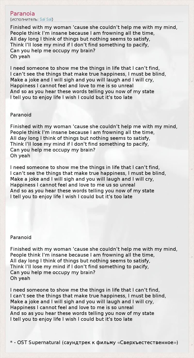 Finished with my woman 'cause she couldn't help me with my mind, People think I'm insane because I am frowning all the time, All day long I think of things but nothing seems to satisfy, Think I'll lose my mind if I don't find something to pacify, Can you help me occupy my brain? Oh yeah I need someone to show me the things in life that I can't find, I can't see the things that make true happiness, I must be blind, Make a joke and I will sigh and you will laugh and I will cry, Happiness I cannot feel and love to me is so unreal And so as you hear these words telling you now of my state I tell you to enjoy life I wish I could but it's too late Paranoid Finished with my woman 'cause she couldn't help me with my mind, People think I'm insane because I am frowning all the time, All day long I think of things but nothing seems to satisfy, Think I'll lose my mind if I don't find something to pacify, Can you help me occupy my brain? Oh yeah I need someone to show me the things in life that I can't find, I can't see the things that make true happiness, I must be blind, Make a joke and I will sigh and you will laugh and I will cry, Happiness I cannot feel and love to me us so unreal And so as you hear these words telling you now of my state I tell you to enjoy life I wish I could but it's too late Paranoid Finished with my woman 'cause she couldn't help me with my mind, People think I'm insane because I am frowning all the time, All day long I think of things but nothing seems to satisfy, Think I'll lose my mind if I don't find something to pacify, Can you help me occupy my brain? Oh yeah I need someone to show me the things in life that I can't find, I can't see the things that make true happiness, I must be blind, Make a joke and I will sigh and you will laugh and I will cry, Happiness I cannot feel and love to me is so unreal And so as you hear these words telling you now of my state I tell you to enjoy life I wish I could but it's too late * - OST Supernatural (саундтрек к фильму «Сверхъестественное»)