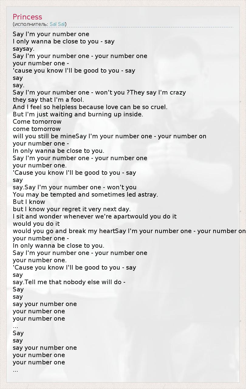 Say I'm your number one I only wanna be close to you - say saysay. Say I'm your number one - your number one your number one - 'cause you know I'll be good to you - say say say. Say I'm your number one - won't you ?They say I'm crazy they say that I'm a fool. And I feel so helpless because love can be so cruel. But I'm just waiting and burning up inside. Come tomorrow come tomorrow will you still be mineSay I'm your number one - your number on your number one - In only wanna be close to you. Say I'm your number one - your number one your number one. 'Cause you know I'll be good to you - say say say.Say I'm your number one - won't you You may be tempted and sometimes led astray. But I know but I know your regret it very next day. I sit and wonder whenever we're apartwould you do it would you do it would you go and break my heartSay I'm your number one - your number on your number one - In only wanna be close to you. Say I'm your number one - your number one your number one. 'Cause you know I'll be good to you - say say say.Tell me that nobody else will do - Say say say your number one your number one your number one ... Say say say your number one your number one your number one ...