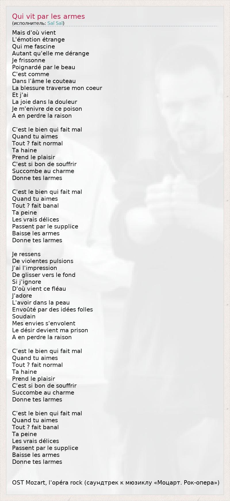 Mais d'où vient L'émotion étrange Qui me fascine Autant qu'elle me dérange Je frissonne Poignardé par le beau C'est comme Dans l'âme le couteau La blessure traverse mon coeur Et j'ai La joie dans la douleur Je m'enivre de ce poison A en perdre la raison C'est le bien qui fait mal Quand tu aimes Tout ? fait normal Ta haine Prend le plaisir C'est si bon de souffrir Succombe au charme Donne tes larmes C'est le bien qui fait mal Quand tu aimes Tout ? fait banal Ta peine Les vrais délices Passent par le supplice Baisse les armes Donne tes larmes Je ressens De violentes pulsions J'ai l'impression De glisser vers le fond Si j'ignore D'où vient ce fléau J'adore L'avoir dans la peau Envoûté par des idées folles Soudain Mes envies s'envolent Le désir devient ma prison A en perdre la raison C'est le bien qui fait mal Quand tu aimes Tout ? fait normal Ta haine Prend le plaisir C'est si bon de souffrir Succombe au charme Donne tes larmes C'est le bien qui fait mal Quand tu aimes Tout ? fait banal Ta peine Les vrais délices Passent par le supplice Baisse les armes Donne tes larmes OST Mozart, l'opéra rock (саундтрек к мюзиклу «Моцарт. Рок-опера»)