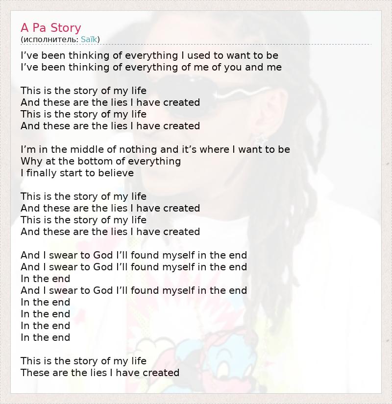 I’ve been thinking of everything I used to want to be I’ve been thinking of everything of me of you and me This is the story of my life And these are the lies I have created This is the story of my life And these are the lies I have created I’m in the middle of nothing and it’s where I want to be Why at the bottom of everything I finally start to believe This is the story of my life And these are the lies I have created This is the story of my life And these are the lies I have created And I swear to God I’ll found myself in the end And I swear to God I’ll found myself in the end In the end And I swear to God I’ll found myself in the end In the end In the end In the end In the end This is the story of my life These are the lies I have created