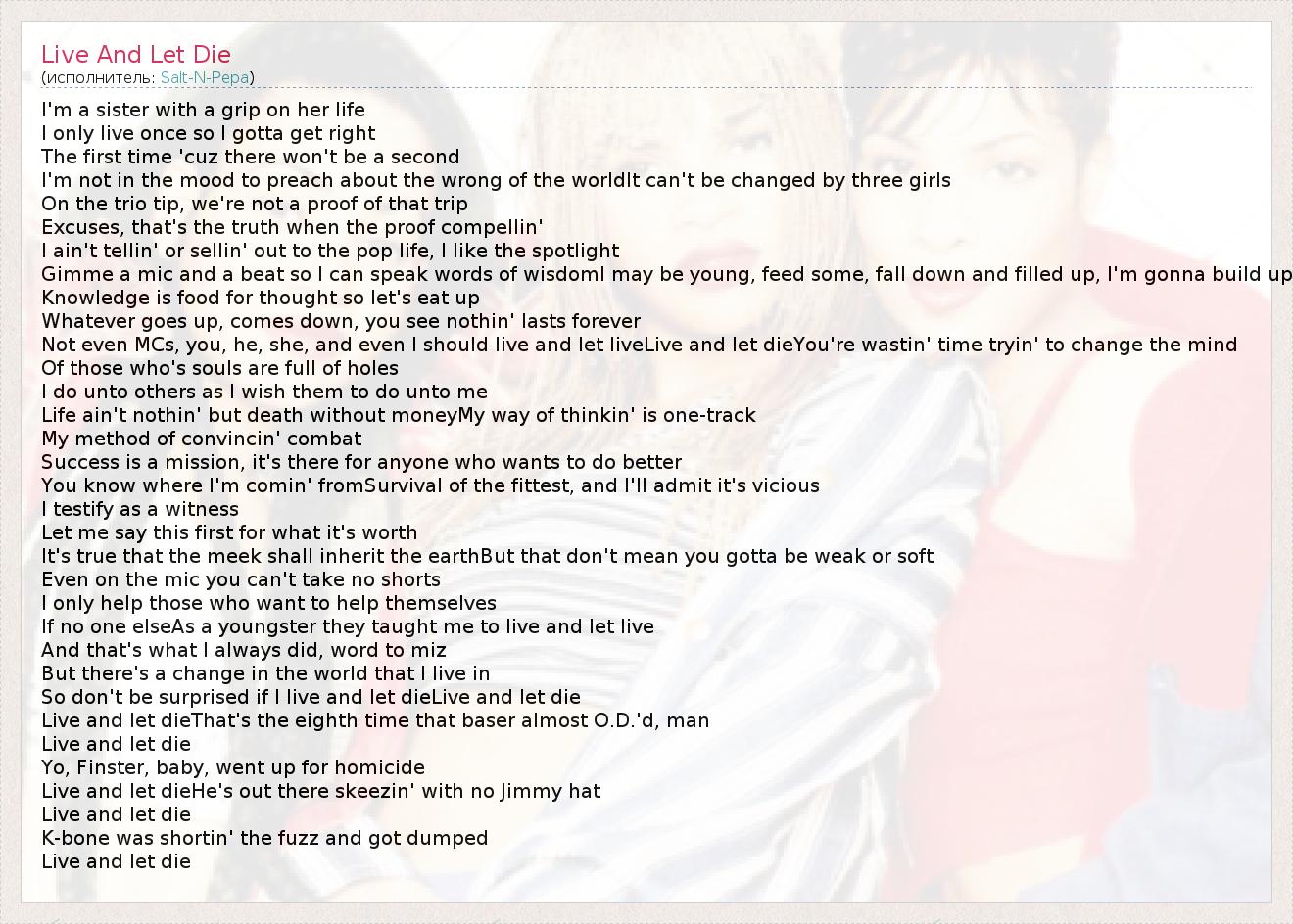 Это интересно:Напомню сразу, что SALT’N’PEPA — это женское трио из Америки.Cheryl ‘Salt’ James родом из нью–йоркского района Бруклин. Sandy‘Pepa’ Denton (р. 9.10.1969 г.) родилась на Ямайке, но росла также в Нью–Йорке (район Куинс). Обе семьи были многодетными.Дамочки познакомились в колледже, затем окончания которого могли начинать воспитателями в детском саду. Обе стали подрабатывать в супермаркете под названием... продолжение