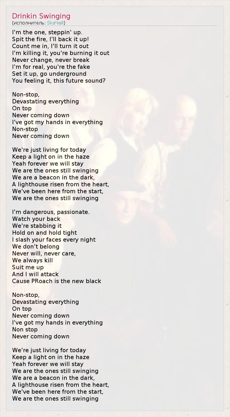I'm the one, steppin' up. Spit the fire, I'll back it up! Count me in, I'll turn it out I'm killing it, you're burning it out Never change, never break I'm for real, you're the fake Set it up, go underground You feeling it, this future sound? Non-stop, Devastating everything On top Never coming down I've got my hands in everything Non-stop Never coming down We're just living for today Keep a light on in the haze Yeah forever we will stay We are the ones still swinging We are a beacon in the dark, A lighthouse risen from the heart, We've been here from the start, We are the ones still swinging I'm dangerous, passionate. Watch your back We're stabbing it Hold on and hold tight I slash your faces every night We don't belong Never will, never care, We always kill Suit me up And I will attack Cause PRoach is the new black Non-stop, Devastating everything On top Never coming down I've got my hands in everything Non stop Never coming down We're just living for today Keep a light on in the haze Yeah forever we will stay We are the ones still swinging We are a beacon in the dark, A lighthouse risen from the heart, We've been here from the start, We are the ones still swinging