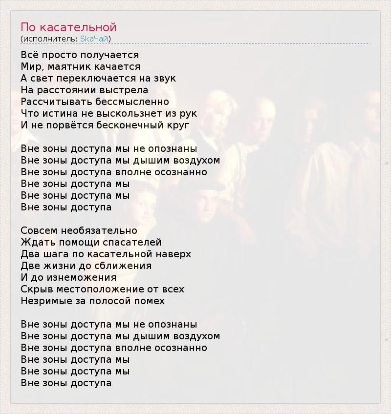 Всё просто получается Мир, маятник качается А свет переключается на звук На расстоянии выстрела Рассчитывать бессмысленно Что истина не выскользнет из рук И не порвётся бесконечный круг Вне зоны доступа мы не опознаны Вне зоны доступа мы дышим воздухом Вне зоны доступа вполне осознанно Вне зоны доступа мы Вне зоны доступа мы Вне зоны доступа Совсем необязательно Ждать помощи спасателей Два шага по касательной наверх Две жизни до сближения И до изнеможения Скрыв местоположение от всех Незримые за полосой помех Вне зоны доступа мы не опознаны Вне зоны доступа мы дышим воздухом Вне зоны доступа вполне осознанно Вне зоны доступа мы Вне зоны доступа мы Вне зоны доступа
