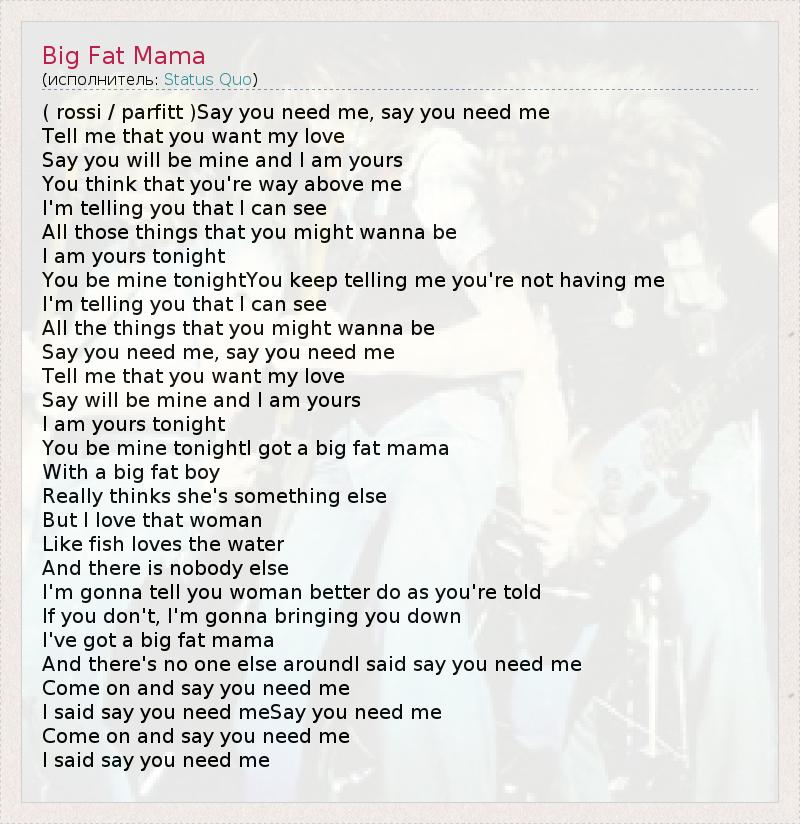 ( rossi / parfitt )Say you need me, say you need me Tell me that you want my love Say you will be mine and I am yours You think that you're way above me I'm telling you that I can see All those things that you might wanna be I am yours tonight You be mine tonightYou keep telling me you're not having me I'm telling you that I can see All the things that you might wanna be Say you need me, say you need me Tell me that you want my love Say will be mine and I am yours I am yours tonight You be mine tonightI got a big fat mama With a big fat boy Really thinks she's something else But I love that woman Like fish loves the water And there is nobody else I'm gonna tell you woman better do as you're told If you don't, I'm gonna bringing you down I've got a big fat mama And there's no one else aroundI said say you need me Come on and say you need me I said say you need meSay you need me Come on and say you need me I said say you need me
