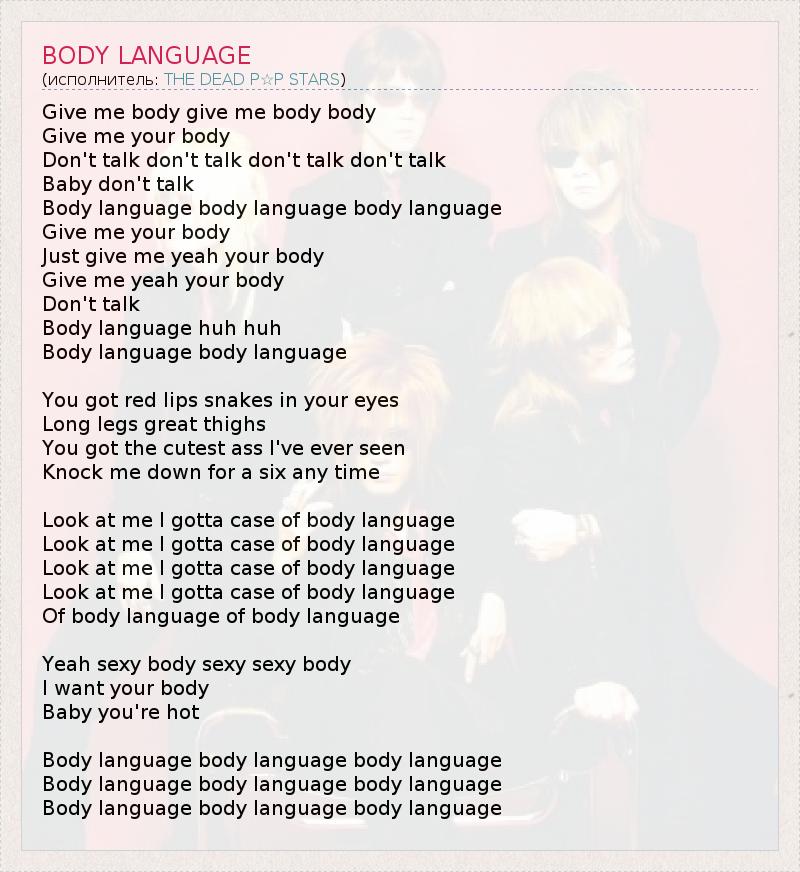 Отдай мне тело, отдай мне тело, тело, Отдай мне свое тело. Не болтай, не болтай, не болтай, не болтай, Детка, не болтай. Язык тела, язык тела, язык тела, Отдай мне свое тело, Просто отдай мне свое тело, Отдай мне свое тело, Не болтай. Язык тела, ха-ха, Язык тела, язык тела. У тебя красные губы, в глазах чертики, Длинные ноги, превосходные бедра. У тебя самая классная зад**ца, какую я когда-либо видел, Ты ошеломляешь меня 1 в любое время. Смотри на меня – я должен исследовать язык тела, Смотри на меня – я должен исследовать язык тела, Смотри на меня – я должен исследовать язык тела, Смотри на меня – я должен исследовать язык тела, Язык тела, язык тела. Да, секси – тело, секси, секси – тело, Я хочу твое тело, Детка, ты горяча. Язык тела, язык тела, язык тела, Язык тела, язык тела, язык тела, Язык тела, язык тела, язык тела. 1 – knock for six – устойч.: ошеломлять, приводить в крайнее изумление.