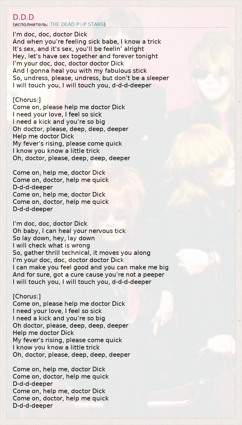 I'm doc, doc, doctor Dick And when you're feeling sick babe, I know a trick It's sex, and it's sex, you'll be feelin' alright Hey, let's have sex together and forever tonight I'm your doc, doc, doctor doctor Dick And I gonna heal you with my fabulous stick So, undress, please, undress, but don't be a sleeper I will touch you, I will touch you, d-d-d-deeper [Chorus:] Come on, please help me doctor Dick I need your love, I feel so sick I need a kick and you're so big Oh doctor, please, deep, deep, deeper Help me doctor Dick My fever's rising, please come quick I know you know a little trick Oh, doctor, please, deep, deep, deeper Come on, help me, doctor Dick Come on, doctor, help me quick D-d-d-deeper Come on, help me, doctor Dick Come on, doctor, help me quick D-d-d-deeper I'm doc, doc, doctor Dick Oh baby, I can heal your nervous tick So lay down, hey, lay down I will check what is wrong So, gather thrill technical, it moves you along I'm your doc, doc, doctor doctor Dick I can make you feel good and you can make me big And for sure, got a cure cause you're not a peeper I will touch you, I will touch you, d-d-d-deeper [Chorus:] Come on, please help me doctor Dick I need your love, I feel so sick I need a kick and you're so big Oh doctor, please, deep, deep, deeper Help me doctor Dick My fever's rising, please come quick I know you know a little trick Oh, doctor, please, deep, deep, deeper Come on, help me, doctor Dick Come on, doctor, help me quick D-d-d-deeper Come on, help me, doctor Dick Come on, doctor, help me quick D-d-d-deeper