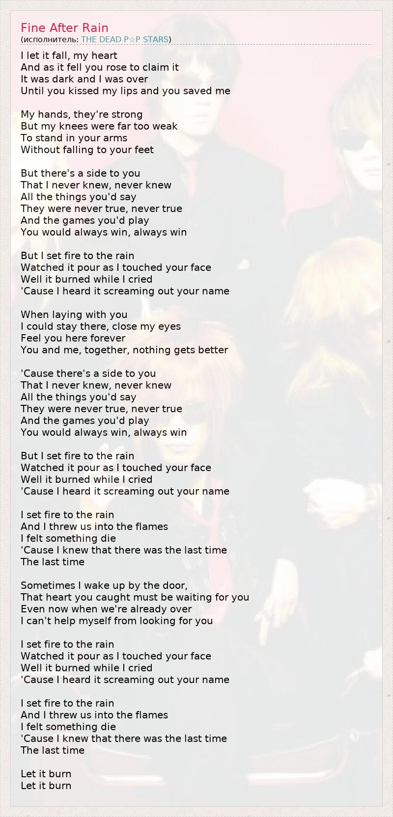 I let it fall, my heart And as it fell you rose to claim it It was dark and I was over Until you kissed mу lips and you saved me My hands, they're strong But my knees were far too weak To stand in your arms Without falling to your feet But there's a side to you That I never knew, never knew All the things you'd say They were never true, never true And the games you'd play You would always win, always win But I set fire to the rain Watched it pour as I touched your face Well it burned while I cried 'Cause I heard it screaming out your name When laying with you I could stay there, close my eyes Feel you here forever You and me, together, nothing gets better 'Cause there's a side to you That I never knew, never knew All the things you'd say They were never true, never true And the games you'd play You would always win, always win But I set fire to the rain Watched it pour as I touched your face Well it burned while I cried 'Cause I heard it screaming out your name I set fire to the rain And I threw us into the flames I felt something die 'Cause I knew that there was the last time The last time Sometimes I wake up by the door, That heart you caught must be waiting for you Even now when we're already over I can't help myself from looking for you I set fire to the rain Watched it pour as I touched your face Well it burned while I cried 'Cause I heard it screaming out your name I set fire to the rain And I threw us into the flames I felt something die 'Cause I knew that there was the last time The last time Let it burn Let it burn