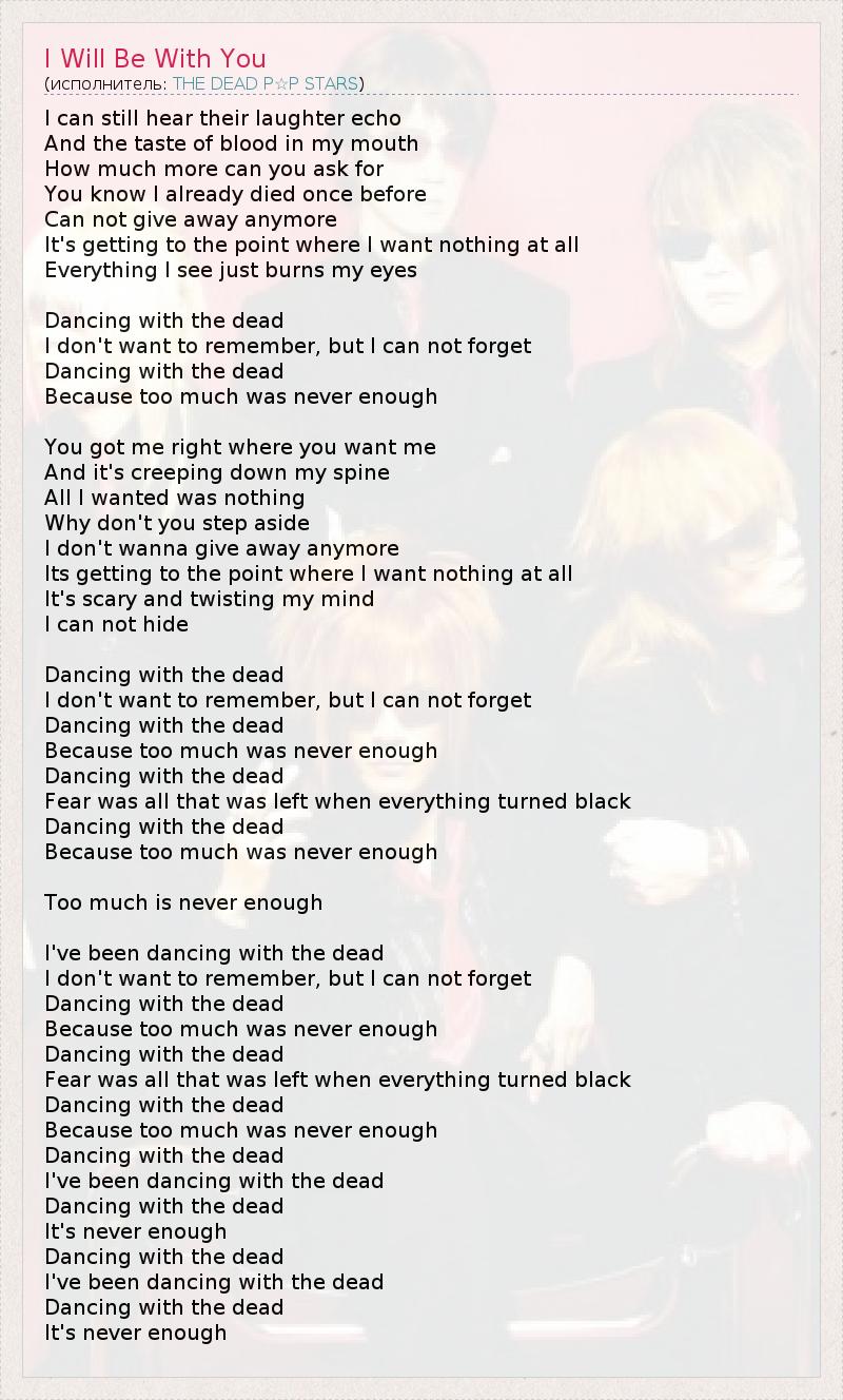 I can still hear their laughter echo And the taste of blood in my mouth How much more can you ask for You know I already died once before Can not give away anymore It's getting to the point where I want nothing at all Everything I see just burns my eyes Dancing with the dead I don't want to remember, but I can not forget Dancing with the dead Because too much was never enough You got me right where you want me And it's creeping down my spine All I wanted was nothing Why don't you step aside I don't wanna give away anymore Its getting to the point where I want nothing at all It's scary and twisting my mind I can not hide Dancing with the dead I don't want to remember, but I can not forget Dancing with the dead Because too much was never enough Dancing with the dead Fear was all that was left when everything turned black Dancing with the dead Because too much was never enough Too much is never enough I've been dancing with the dead I don't want to remember, but I can not forget Dancing with the dead Because too much was never enough Dancing with the dead Fear was all that was left when everything turned black Dancing with the dead Because too much was never enough Dancing with the dead I've been dancing with the dead Dancing with the dead It's never enough Dancing with the dead I've been dancing with the dead Dancing with the dead It's never enough