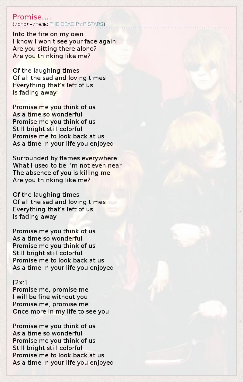 Сгорая изнутри, Я знаю, что не увижу тебя снова. Ты сейчас одна И думаешь о том же? И времена веселья, И грусти, и любви времена - Всё, что осталось от нас, Исчезает. Обещай мне думать о нас, О том, как было прекрасно. Обещай мне думать о нас, Так же ярко и красочно. Обещай мне оглянуться назад, На то время, когда ты наслаждалась жизнью. Языки пламени окружают Образ прежнего меня, хотя я сам далеко... Меня убивает то, что тебя нет рядом. Думаешь ли ты о том же? И времена веселья, И грусти, и любви времена - Всё, что осталось от нас, Исчезает. Обещай мне думать о нас, О том, как было прекрасно. Обещай мне думать о нас, Так же ярко и красочно. Обещай мне оглянуться назад, На то время, когда ты наслаждалась жизнью. [2 раза:] Обещай мне, обещай мне. Мне будет хорошо без тебя. Обещай мне, обещай мне. Ещё раз в жизни увидеть тебя. Обещай мне думать о нас, О том, как было прекрасно. Обещай мне думать о нас, Так же ярко и красочно. Обещай мне оглянуться назад, На то время, когда ты наслаждалась жизнью.