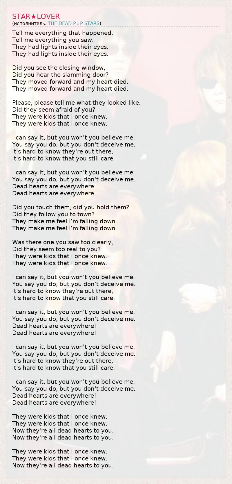 Tell me everything that happened. Tell me everything you saw. They had lights inside their eyes. They had lights inside their eyes. Did you see the closing window, Did you hear the slamming door? They moved forward and my heart died. They moved forward and my heart died. Please, please tell me what they looked like. Did they seem afraid of you? They were kids that I once knew. They were kids that I once knew. I can say it, but you won't you believe me. You say you do, but you don't deceive me. It's hard to know they're out there, It's hard to know that you still care. I can say it, but you won't you believe me. You say you do, but you don't deceive me. Dead hearts are everywhere Dead hearts are everywhere Did you touch them, did you hold them? Did they follow you to town? They make me feel I'm falling down. They make me feel I'm falling down. Was there one you saw too clearly, Did they seem too real to you? They were kids that I once knew. They were kids that I once knew. I can say it, but you won't you believe me. You say you do, but you don't deceive me. It's hard to know they're out there, It's hard to know that you still care. I can say it, but you won't you believe me. You say you do, but you don't deceive me. Dead hearts are everywhere! Dead hearts are everywhere! I can say it, but you won't you believe me. You say you do, but you don't deceive me. It's hard to know they're out there, It's hard to know that you still care. I can say it, but you won't you believe me. You say you do, but you don't deceive me. Dead hearts are everywhere! Dead hearts are everywhere! They were kids that I once knew. They were kids that I once knew. Now they're all dead hearts to you. Now they're all dead hearts to you. They were kids that I once knew. They were kids that I once knew. Now they're all dead hearts to you.