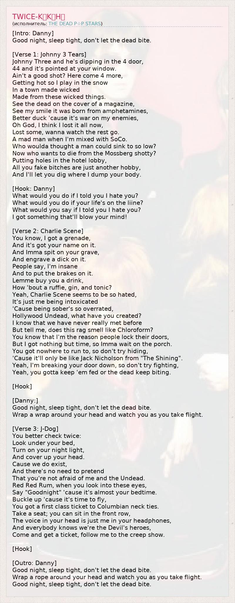 [Intro: Danny] Good night, sleep tight, don't let the dead bite. [Verse 1: Johnny 3 Tears] Johnny Three and he's dipping in the 4 door, 44 and it's pointed at your window. Ain't a good shot? Here come 4 more, Getting hot so I play in the snow In a town made wicked Made from these wicked things. See the dead on the cover of a magazine, See my smile it was born from amphetamines, Better duck 'cause it's war on my enemies, Oh God, I think I lost it all now, Lost some, wanna watch the rest go. A mad man when I'm mixed with SoCo. Who woulda thought a man could sink to so low? Now who wants to die from the Mossberg shotty? Putting holes in the hotel lobby, All you fake bitches are just another hobby, And I'll let you dig where I dump your body. [Hook: Danny] What would you do if I told you I hate you? What would you do if your life's on the liine? What would you say if I told you I hate you? I got something that'll blow your mind! [Verse 2: Charlie Scene] You know, I got a grenade, And it's got your name on it. And Imma spit on your grave, And engrave a dick on it. People say, I'm insane And to put the brakes on it. Lemme buy you a drink, How 'bout a ruffie, gin, and tonic? Yeah, Charlie Scene seems to be so hated, It's just me being intoxicated 'Cause being sober's so overrated, Hollywood Undead, what have you created? I know that we have never really met before But tell me, does this rag smell like Chloroform? You know that I'm the reason people lock their doors, But I got nothing but time, so Imma wait on the porch. You got nowhere to run to, so don't try hiding, 'Cause it'll only be like Jack Nicholson from "The Shining". Yeah, I'm breaking your door down, so don't try fighting, Yeah, you gotta keep 'em fed or the dead keep biting. [Hook] [Danny:] Good night, sleep tight, don't let the dead bite. Wrap a wrap around your head and watch you as you take flight. [Verse 3: J-Dog] You better check twice: Look under your bed, Turn on your night light, And cover up your head. Cause we do exist, And there's no need to pretend That you're not afraid of me and the Undead. Red Red Rum, when you look into these eyes, Say "Goodnight" 'cause it's almost your bedtime. Buckle up 'cause it's time to fly, You got a first class ticket to Columbian neck ties. Take a seat; you can sit in the front row, The voice in your head is just me in your headphones, And everybody knows we're the Devil's heroes, Come and get a ticket, follow me to the creep show. [Hook] [Outro: Danny] Good night, sleep tight, don't let the dead bite. Wrap a rope around your head and watch you as you take flight. Good night, sleep tight, don't let the dead bite.