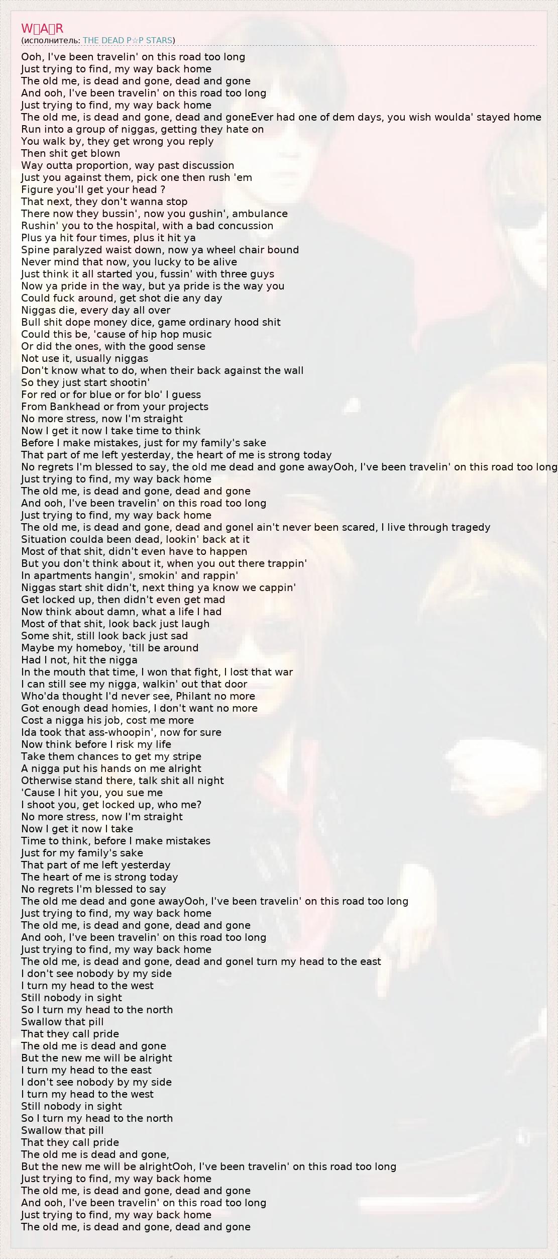 Ooh, I've been travelin' on this road too long Just trying to find, my way back home The old me, is dead and gone, dead and gone And ooh, I've been travelin' on this road too long Just trying to find, my way back home The old me, is dead and gone, dead and goneEver had one of dem days, you wish woulda' stayed home Run into a group of niggas, getting they hate on You walk by, they get wrong you reply Then shit get blown Way outta proportion, way past discussion Just you against them, pick one then rush 'em Figure you'll get your head ? That next, they don't wanna stop There now they bussin', now you gushin', ambulance Rushin' you to the hospital, with a bad concussion Plus ya hit four times, plus it hit ya Spine paralyzed waist down, now ya wheel chair bound Never mind that now, you lucky to be alive Just think it all started you, fussin' with three guys Now ya pride in the way, but ya pride is the way you Could fuck around, get shot die any day Niggas die, every day all over Bull shit dope money dice, game ordinary hood shit Could this be, 'cause of hip hop music Or did the ones, with the good sense Not use it, usually niggas Don't know what to do, when their back against the wall So they just start shootin' For red or for blue or for blo' I guess From Bankhead or from your projects No more stress, now I'm straight Now I get it now I take time to think Before I make mistakes, just for my family's sake That part of me left yesterday, the heart of me is strong today No regrets I'm blessed to say, the old me dead and gone awayOoh, I've been travelin' on this road too long Just trying to find, my way back home The old me, is dead and gone, dead and gone And ooh, I've been travelin' on this road too long Just trying to find, my way back home The old me, is dead and gone, dead and goneI ain't never been scared, I live through tragedy Situation coulda been dead, lookin' back at it Most of that shit, didn't even have to happen But you don't think about it, when you out there trappin' In apartments hangin', smokin' and rappin' Niggas start shit didn't, next thing ya know we cappin' Get locked up, then didn't even get mad Now think about damn, what a life I had Most of that shit, look back just laugh Some shit, still look back just sad Maybe my homeboy, 'till be around Had I not, hit the nigga In the mouth that time, I won that fight, I lost that war I can still see my nigga, walkin' out that door Who'da thought I'd never see, Philant no more Got enough dead homies, I don't want no more Cost a nigga his job, cost me more Ida took that ass-whoopin', now for sure Now think before I risk my life Take them chances to get my stripe A nigga put his hands on me alright Otherwise stand there, talk shit all night 'Cause I hit you, you sue me I shoot you, get locked up, who me? No more stress, now I'm straight Now I get it now I take Time to think, before I make mistakes Just for my family's sake That part of me left yesterday The heart of me is strong today No regrets I'm blessed to say The old me dead and gone awayOoh, I've been travelin' on this road too long Just trying to find, my way back home The old me, is dead and gone, dead and gone And ooh, I've been travelin' on this road too long Just trying to find, my way back home The old me, is dead and gone, dead and goneI turn my head to the east I don't see nobody by my side I turn my head to the west Still nobody in sight So I turn my head to the north Swallow that pill That they call pride The old me is dead and gone But the new me will be alright I turn my head to the east I don't see nobody by my side I turn my head to the west Still nobody in sight So I turn my head to the north Swallow that pill That they call pride The old me is dead and gone, But the new me will be alrightOoh, I've been travelin' on this road too long Just trying to find, my way back home The old me, is dead and gone, dead and gone And ooh, I've been travelin' on this road too long Just trying to find, my way back home The old me, is dead and gone, dead and gone
