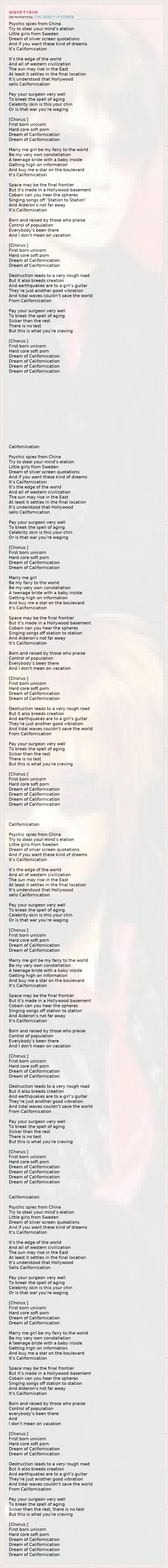 Psychic spies from China Try to steal your mind's elation Little girls from Sweden Dream of silver screen quotations And if you want these kind of dreams It's Californication It's the edge of the world And all of western civilization The sun may rise in the East At least it settles in the final location It's understood that Hollywood sells Californication Pay your surgeon very well To break the spell of aging Celebrity skin is this your chin Or is that war you're waging [Chorus:] First born unicorn Hard core soft porn Dream of Californication Dream of Californication Marry me girl be my fairy to the world Be my very own constellation A teenage bride with a baby inside Getting high on information And buy me a star on the boulevard It's Californication Space may be the final frontier But it's made in a Hollywood basement Cobain can you hear the spheres Singing songs off 'Station to Station' And Alderon's not far away It's Californication Born and raised by those who praise Control of population Everybody's been there And I don't mean on vacation [Chorus:] First born unicorn Hard core soft porn Dream of Californication Dream of Californication Destruction leads to a very rough road But it also breeds creation And earthquakes are to a girl's guitar They're just another good vibration And tidal waves couldn't save the world From Californication Pay your surgeon very well To break the spell of aging Sicker than the rest There is no test But this is what you're craving [Chorus:] First born unicorn Hard core soft porn Dream of Californication Dream of Californication Dream of Californication Dream of Californication Californication Psychic spies from China Try to steal your mind's elation Little girls from Sweden Dream of silver screen quotations And if you want these kind of dreams It's Californication It's the edge of the world And all of western civilization The sun may rise in the East At least it settles in the final location It's understood that Hollywood sells Californication Pay your surgeon very well To break the spell of aging Celebrity skin is this your chin Or is that war you're waging [Chorus:] First born unicorn Hard core soft porn Dream of Californication Dream of Californication Marry me girl Be my fairy to the world Be my very own constellation A teenage bride with a baby inside Getting high on information And buy me a star on the boulevard It's Californication Space may be the final frontier But it's made in a Hollywood basement Cobain can you hear the spheres Singing songs off station to station And Alderon's not far away It's Californication Born and raised by those who praise Control of population Everybody's been there And I don't mean on vacation [Chorus:] First born unicorn Hard core soft porn Dream of Californication Dream of Californication Destruction leads to a very rough road But it also breeds creation And earthquakes are to a girl's guitar They're just another good vibration And tidal waves couldn't save the world From Californication Pay your surgeon very well To break the spell of aging Sicker than the rest There is no test But this is what you're craving [Chorus:] First born unicorn Hard core soft porn Dream of Californication Dream of Californication Dream of Californication Dream of Californication Californication Psychic spies from China Try to steal your mind's elation Little girls from Sweden Dream of silver screen quotations And if you want these kind of dreams It's Californication It's the edge of the world And all of western civilization The sun may rise in the East At least it settles in the final location It's understood that Hollywood sells Californication Pay your surgeon very well To break the spell of aging Celebrity skin is this your chin Or is that war you're waging [Chorus:] First born unicorn Hard core soft porn Dream of Californication Dream of Californication Marry me girl be my fairy to the world Be my very own constellation A teenage bride with a baby inside Getting high on information And buy me a star on the boulevard It's Californication Space may be the final frontier But it's made in a Hollywood basement Cobain can you hear the spheres Singing songs off station to station And Alderon's not far away It's Californication Born and raised by those who praise Control of population Everybody's been there And I don't mean on vacation [Chorus:] First born unicorn Hard core soft porn Dream of Californication Dream of Californication Destruction leads to a very rough road But it also breeds creation And earthquakes are to a girl's guitar They're just another good vibration And tidal waves couldn't save the world From Californication Pay your surgeon very well To break the spell of aging Sicker than the rest There is no test But this is what you're craving [Chorus:] First born unicorn Hard core soft porn Dream of Californication Dream of Californication Dream of Californication Dream of Californication Californication Psychic spies from China Try to steal your mind's elation Little girls from Sweden Dream of silver screen quotations And if you want these kind of dreams It's Californication It's the edge of the world And all of western civilization The sun may rise in the East At least it settles in the final location It's understood that Hollywood Sells Californication Pay your surgeon very well To break the spell of aging Celebrity skin is this your chin Or is that war you're waging [Chorus:] First born unicorn Hard core soft porn Dream of Californication Dream of Californication Marry me girl be my fairy to the world Be my very own constellation A teenage bride with a baby inside Getting high on information And buy me a star on the boulevard It's Californication Space may be the final frontier But it's made in a Hollywood basement Cobain can you hear the spheres Singing songs off station to station And Alderon's not far away It's Californication Born and raised by those who praise Control of population everybody's been there And I don't mean on