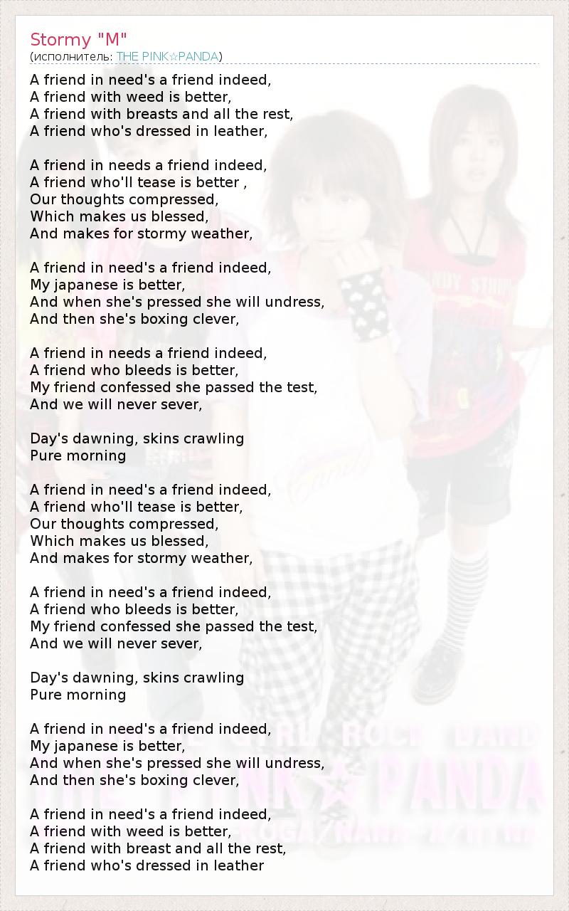 A friend in need's a friend indeed, A friend with weed is better, A friend with breasts and all the rest, A friend who's dressed in leather, A friend in needs a friend indeed, A friend who'll tease is better , Our thoughts compressed, Which makes us blessed, And makes for stormy weather, A friend in need's a friend indeed, My japanese is better, And when she's pressed she will undress, And then she's boxing clever, A friend in needs a friend indeed, A friend who bleeds is better, My friend confessed she passed the test, And we will never sever, Day's dawning, skins crawling Pure morning A friend in need's a friend indeed, A friend who'll tease is better, Our thoughts compressed, Which makes us blessed, And makes for stormy weather, A friend in need's a friend indeed, A friend who bleeds is better, My friend confessed she passed the test, And we will never sever, Day's dawning, skins crawling Pure morning A friend in need's a friend indeed, My japanese is better, And when she's pressed she will undress, And then she's boxing clever, A friend in need's a friend indeed, A friend with weed is better, A friend with breast and all the rest, A friend who's dressed in leather