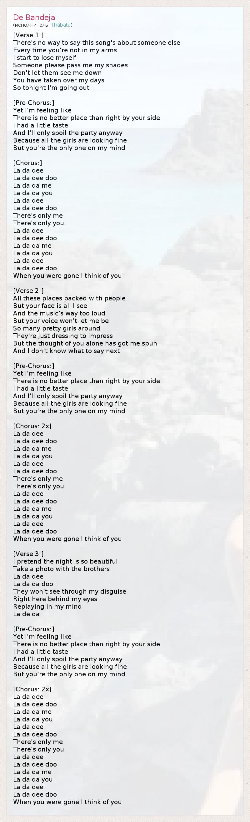 [Verse 1:] There's no way to say this song's about someone else Every time you're not in my arms I start to lose myself Someone please pass me my shades Don't let them see me down You have taken over my days So tonight I'm going out [Pre-Chorus:] Yet I'm feeling like There is no better place than right by your side I had a little taste And I'll only spoil the party anyway Because all the girls are looking fine But you're the only one on my mind [Chorus:] La da dee La da dee doo La da da me La da da you La da dee La da dee doo There's only me There's only you La da dee La da dee doo La da da me La da da you La da dee La da dee doo When you were gone I think of you [Verse 2:] All these places packed with people But your face is all I see And the music's way too loud But your voice won't let me be So many pretty girls around They're just dressing to impress But the thought of you alone has got me spun And I don't know what to say next [Pre-Chorus:] Yet I'm feeling like There is no better place than right by your side I had a little taste And I'll only spoil the party anyway Because all the girls are looking fine But you're the only one on my mind [Chorus: 2x] La da dee La da dee doo La da da me La da da you La da dee La da dee doo There's only me There's only you La da dee La da dee doo La da da me La da da you La da dee La da dee doo When you were gone I think of you [Verse 3:] I pretend the night is so beautiful Take a photo with the brothers La da dee La da da doo They won't see through my disguise Right here behind my eyes Replaying in my mind La de da [Pre-Chorus:] Yet I'm feeling like There is no better place than right by your side I had a little taste And I'll only spoil the party anyway Because all the girls are looking fine But you're the only one on my mind [Chorus: 2x] La da dee La da dee doo La da da me La da da you La da dee La da dee doo There's only me There's only you La da dee La da dee doo La da da me La da da you La da dee La da dee doo When you were gone I think of you