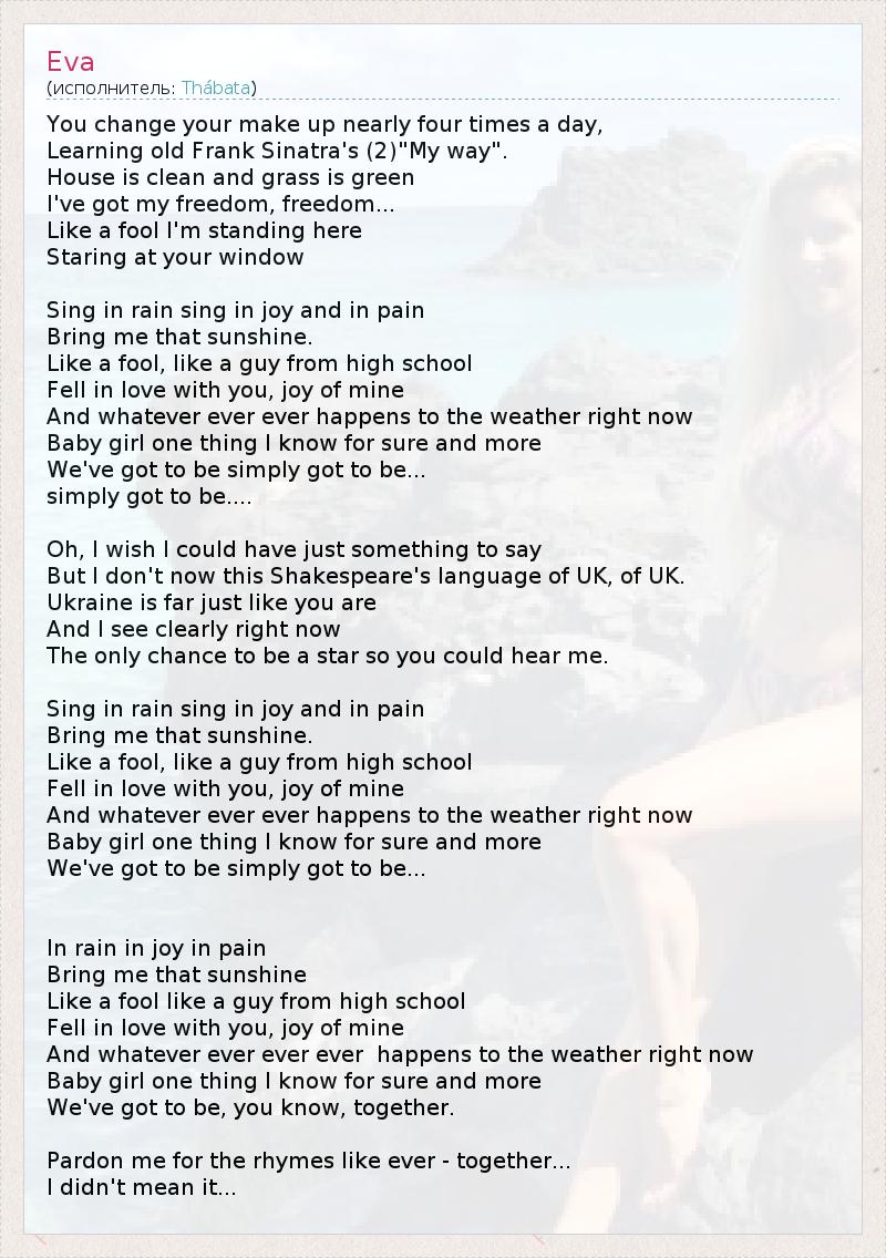 You change your make up nearly four times a day, Learning old Frank Sinatra's (2)"My way". House is clean and grass is green I've got my freedom, freedom... Like a fool I'm standing here Staring at your window Sing in rain sing in joy and in pain Bring me that sunshine. Like a fool, like a guy from high school Fell in love with you, joy of mine And whatever ever ever happens to the weather right now Baby girl one thing I know for sure and more We've got to be simply got to be... simply got to be.... Oh, I wish I could have just something to say But I don't now this Shakespeare's language of UK, of UK. Ukraine is far just like you are And I see clearly right now The only chance to be a star so you could hear me. Sing in rain sing in joy and in pain Bring me that sunshine. Like a fool, like a guy from high school Fell in love with you, joy of mine And whatever ever ever happens to the weather right now Baby girl one thing I know for sure and more We've got to be simply got to be... In rain in joy in pain Bring me that sunshine Like a fool like a guy from high school Fell in love with you, joy of mine And whatever ever ever ever happens to the weather right now Baby girl one thing I know for sure and more We've got to be, you know, together. Pardon me for the rhymes like ever - together... I didn't mean it...