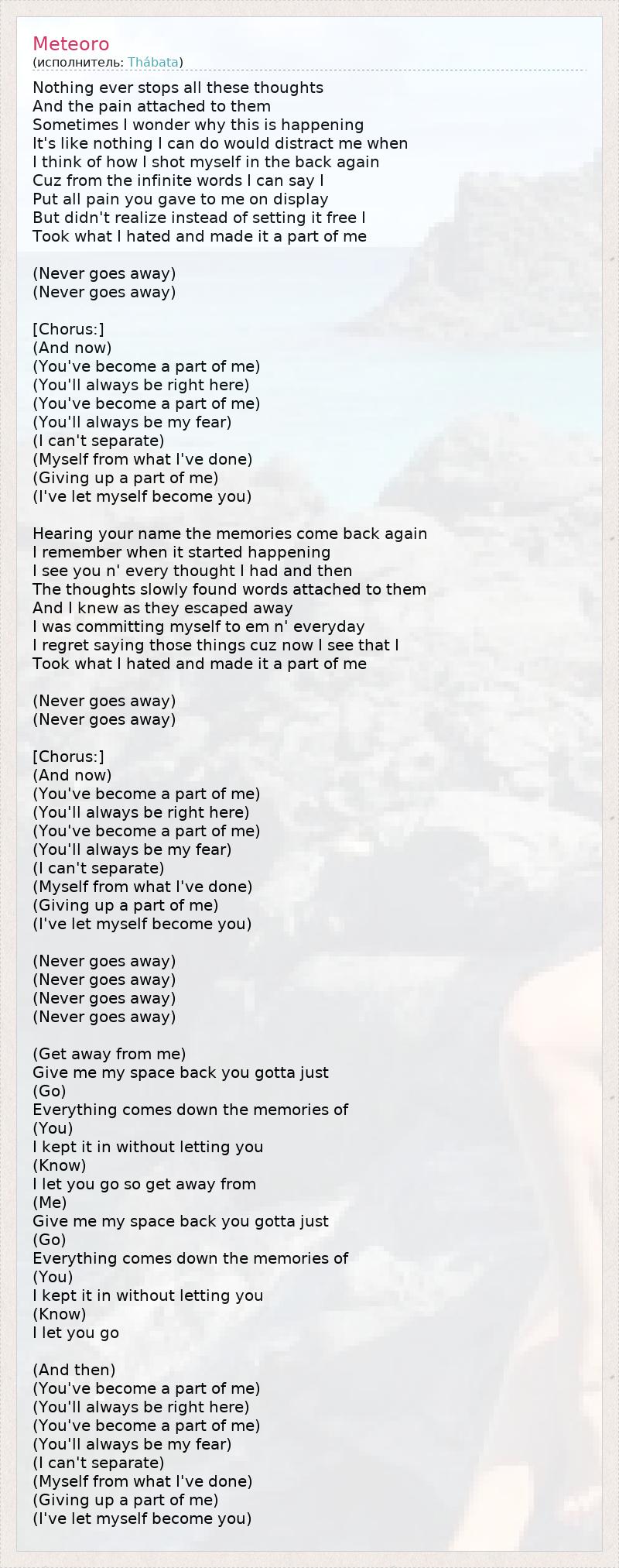 Nothing ever stops all these thoughts And the pain attached to them Sometimes I wonder why this is happening It's like nothing I can do would distract me when I think of how I shot myself in the back again Cuz from the infinite words I can say I Put all pain you gave to me on display But didn't realize instead of setting it free I Took what I hated and made it a part of me (Never goes away) (Never goes away) [Chorus:] (And now) (You've become a part of me) (You'll always be right here) (You've become a part of me) (You'll always be my fear) (I can't separate) (Myself from what I've done) (Giving up a part of me) (I've let myself become you) Hearing your name the memories come back again I remember when it started happening I see you n' every thought I had and then The thoughts slowly found words attached to them And I knew as they escaped away I was committing myself to em n' everyday I regret saying those things cuz now I see that I Took what I hated and made it a part of me (Never goes away) (Never goes away) [Chorus:] (And now) (You've become a part of me) (You'll always be right here) (You've become a part of me) (You'll always be my fear) (I can't separate) (Myself from what I've done) (Giving up a part of me) (I've let myself become you) (Never goes away) (Never goes away) (Never goes away) (Never goes away) (Get away from me) Give me my space back you gotta just (Go) Everything comes down the memories of (You) I kept it in without letting you (Know) I let you go so get away from (Me) Give me my space back you gotta just (Go) Everything comes down the memories of (You) I kept it in without letting you (Know) I let you go (And then) (You've become a part of me) (You'll always be right here) (You've become a part of me) (You'll always be my fear) (I can't separate) (Myself from what I've done) (Giving up a part of me) (I've let myself become you)
