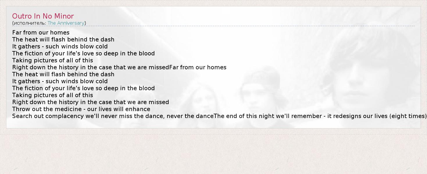 Far from our homes The heat will flash behind the dash It gathers - such winds blow cold The fiction of your life's love so deep in the blood Taking pictures of all of this Right down the history in the case that we are missedFar from our homes The heat will flash behind the dash It gathers - such winds blow cold The fiction of your life's love so deep in the blood Taking pictures of all of this Right down the history in the case that we are missed Throw out the medicine - our lives will enhance Search out complacency we'll never miss the dance, never the danceThe end of this night we'll remember - it redesigns our lives (eight times)