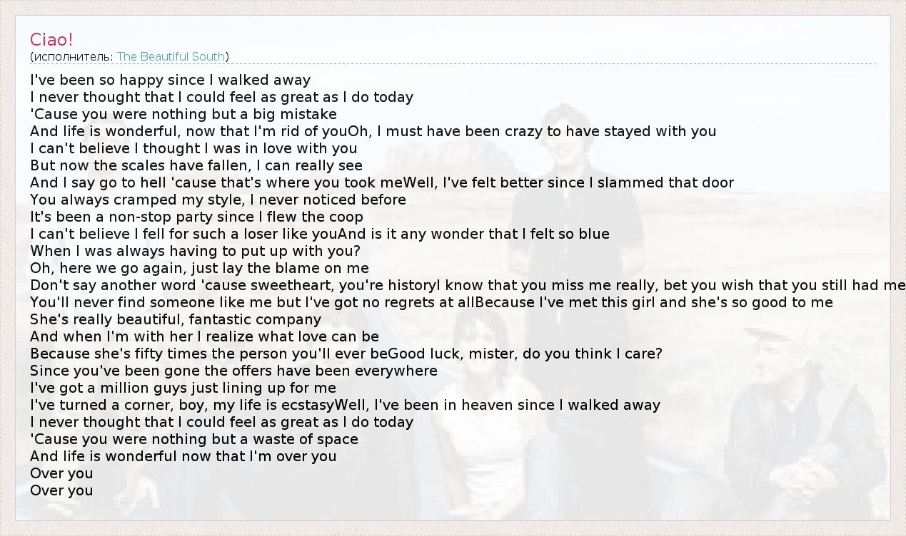 I've been so happy since I walked away I never thought that I could feel as great as I do today 'Cause you were nothing but a big mistake And life is wonderful, now that I'm rid of youOh, I must have been crazy to have stayed with you I can't believe I thought I was in love with you But now the scales have fallen, I can really see And I say go to hell 'cause that's where you took meWell, I've felt better since I slammed that door You always cramped my style, I never noticed before It's been a non-stop party since I flew the coop I can't believe I fell for such a loser like youAnd is it any wonder that I felt so blue When I was always having to put up with you? Oh, here we go again, just lay the blame on me Don't say another word 'cause sweetheart, you're historyI know that you miss me really, bet you wish that you still had me You'll never find someone like me but I've got no regrets at allBecause I've met this girl and she's so good to me She's really beautiful, fantastic company And when I'm with her I realize what love can be Because she's fifty times the person you'll ever beGood luck, mister, do you think I care? Since you've been gone the offers have been everywhere I've got a million guys just lining up for me I've turned a corner, boy, my life is ecstasyWell, I've been in heaven since I walked away I never thought that I could feel as great as I do today 'Cause you were nothing but a waste of space And life is wonderful now that I'm over you Over you Over you