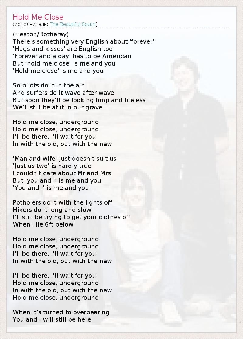 (Heaton/Rotheray) There's something very English about 'forever' 'Hugs and kisses' are English too 'Forever and a day' has to be American But 'hold me close' is me and you 'Hold me close' is me and you So pilots do it in the air And surfers do it wave after wave But soon they'll be looking limp and lifeless We'll still be at it in our grave Hold me close, underground Hold me close, underground I'll be there, I'll wait for you In with the old, out with the new 'Man and wife' just doesn't suit us 'Just us two' is hardly true I couldn't care about Mr and Mrs But 'you and I' is me and you 'You and I' is me and you Potholers do it with the lights off Hikers do it long and slow I'll still be trying to get your clothes off When I lie 6ft below Hold me close, underground Hold me close, underground I'll be there, I'll wait for you In with the old, out with the new I'll be there, I'll wait for you Hold me close, underground In with the old, out with the new Hold me close, underground When it's turned to overbearing You and I will still be here