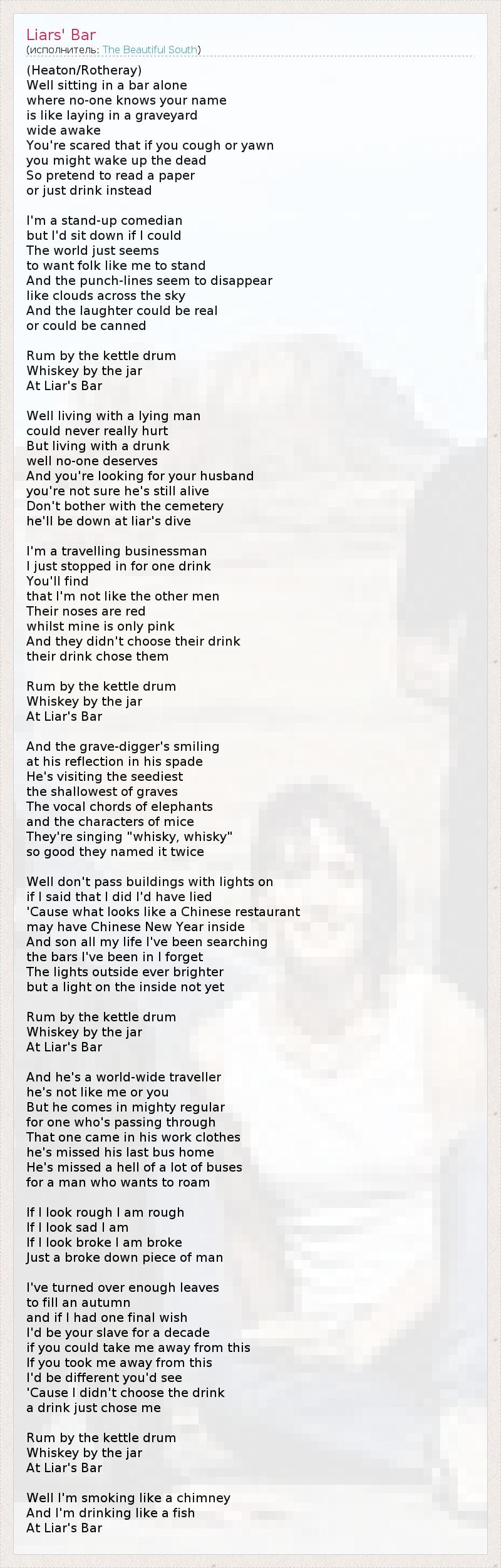 А как ты думаешь, о чем песня "Liars' Bar" ?