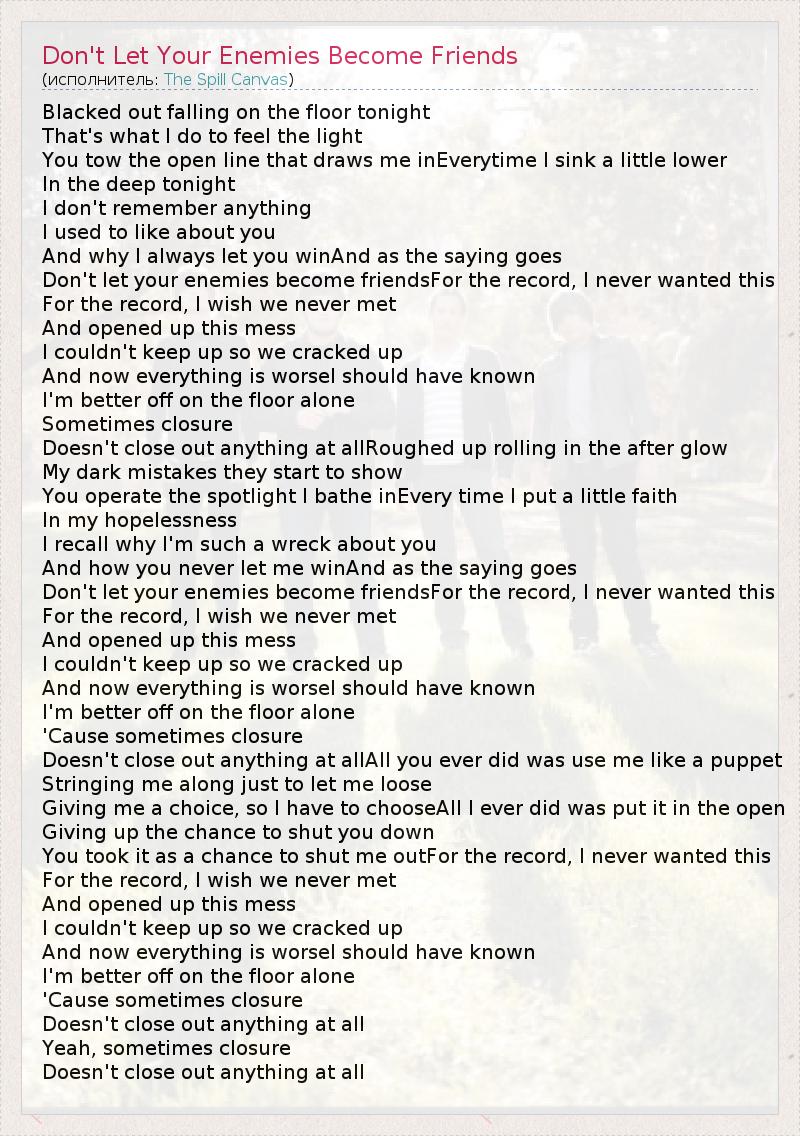 ГлавнаяИсполнителиThe Spill CanvasDon't Let Your Enemies Become Friends