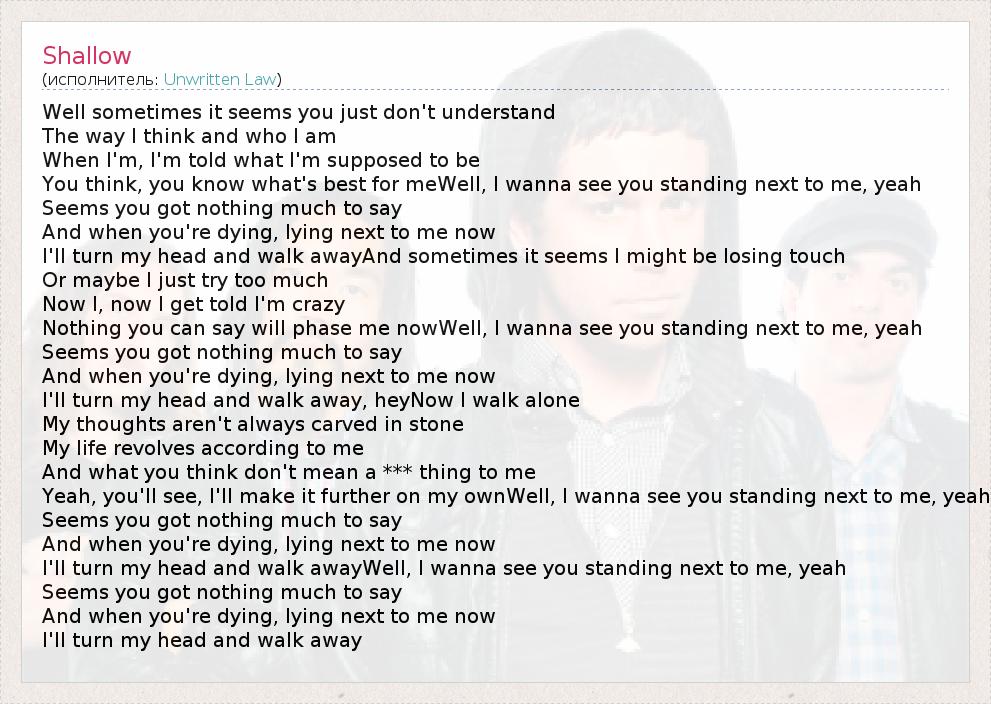 Это интересно:Unwritten Law — американская рок-группа, образовавшаяся в 1990 году в Пауей, штат Калифорния (пригород Сан-Диего) и записывающаяся сейчас на Abydos Records. Они выпустили семь полноценных альбомов, выступали с концертами в разных странах, включая выступление на Vans Warped Tour. Они широко известны благодаря своим синглам "Seein' Red," "Rest of My Life," и "Save Me (Wake Up Call)." Их последний альбом, Swan, вышел 27... продолжение