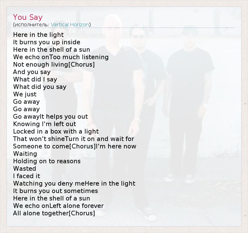 Here in the light It burns you up inside Here in the shell of a sun We echo onToo much listening Not enough living[Chorus] And you say What did I say What did you say We just Go away Go away Go awayIt helps you out Knowing I'm left out Locked in a box with a light That won't shineTurn it on and wait for Someone to come[Chorus]I'm here now Waiting Holding on to reasons Wasted I faced it Watching you deny meHere in the light It burns you out sometimes Here in the shell of a sun We echo onLeft alone forever All alone together[Chorus]