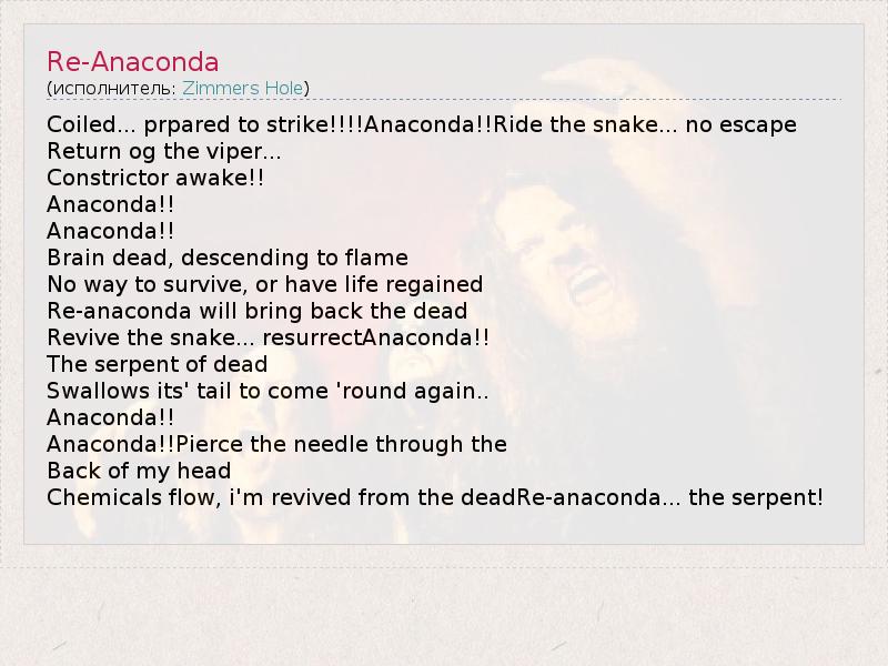Coiled... prpared to strike!!!!Anaconda!!Ride the snake... no escape Return og the viper... Constrictor awake!! Anaconda!! Anaconda!! Brain dead, descending to flame No way to survive, or have life regained Re-anaconda will bring back the dead Revive the snake... resurrectAnaconda!! The serpent of dead Swallows its' tail to come 'round again.. Anaconda!! Anaconda!!Pierce the needle through the Back of my head Chemicals flow, i'm revived from the deadRe-anaconda... the serpent!