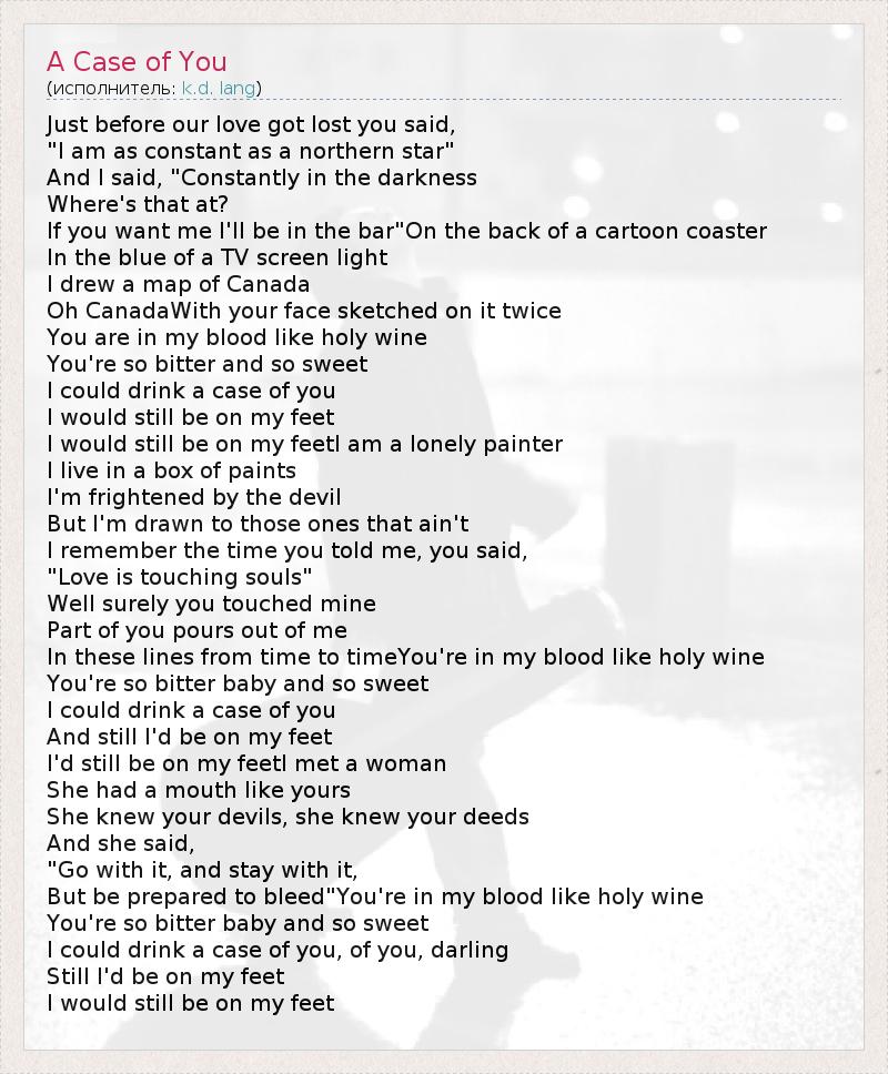 Just before our love got lost you said, "I am as constant as a northern star" And I said, "Constantly in the darkness Where's that at? If you want me I'll be in the bar"On the back of a cartoon coaster In the blue of a TV screen light I drew a map of Canada Oh CanadaWith your face sketched on it twice You are in my blood like holy wine You're so bitter and so sweet I could drink a case of you I would still be on my feet I would still be on my feetI am a lonely painter I live in a box of paints I'm frightened by the devil But I'm drawn to those ones that ain't I remember the time you told me, you said, "Love is touching souls" Well surely you touched mine Part of you pours out of me In these lines from time to timeYou're in my blood like holy wine You're so bitter baby and so sweet I could drink a case of you And still I'd be on my feet I'd still be on my feetI met a woman She had a mouth like yours She knew your devils, she knew your deeds And she said, "Go with it, and stay with it, But be prepared to bleed"You're in my blood like holy wine You're so bitter baby and so sweet I could drink a case of you, of you, darling Still I'd be on my feet I would still be on my feet