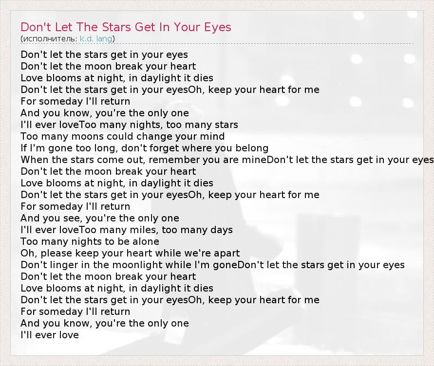Don't let the stars get in your eyes Don't let the moon break your heart Love blooms at night, in daylight it dies Don't let the stars get in your eyesOh, keep your heart for me For someday I'll return And you know, you're the only one I'll ever loveToo many nights, too many stars Too many moons could change your mind If I'm gone too long, don't forget where you belong When the stars come out, remember you are mineDon't let the stars get in your eyes Don't let the moon break your heart Love blooms at night, in daylight it dies Don't let the stars get in your eyesOh, keep your heart for me For someday I'll return And you see, you're the only one I'll ever loveToo many miles, too many days Too many nights to be alone Oh, please keep your heart while we're apart Don't linger in the moonlight while I'm goneDon't let the stars get in your eyes Don't let the moon break your heart Love blooms at night, in daylight it dies Don't let the stars get in your eyesOh, keep your heart for me For someday I'll return And you know, you're the only one I'll ever love