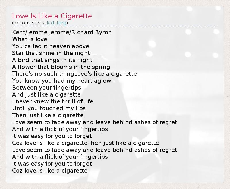 Kent/Jerome Jerome/Richard Byron What is love You called it heaven above Star that shine in the night A bird that sings in its flight A flower that blooms in the spring There's no such thingLove's like a cigarette You know you had my heart aglow Between your fingertips And just like a cigarette I never knew the thrill of life Until you touched my lips Then just like a cigarette Love seem to fade away and leave behind ashes of regret And with a flick of your fingertips It was easy for you to forget Coz love is like a cigaretteThen just like a cigarette Love seem to fade away and leave behind ashes of regret And with a flick of your fingertips It was easy for you to forget Coz love is like a cigarette