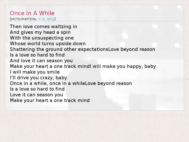 Then love comes waltzing in And gives my head a spin With the unsuspecting one Whose world turns upside down Shattering the ground other expectationsLove beyond reason Is a love so hard to find And love it can season you Make your heart a one track mindI will make you happy, baby I will make you smile I'll drive you crazy, baby Once in a while, once in a whileLove beyond reason Is a love so hard to find Love it can season you Make your heart a one track mind