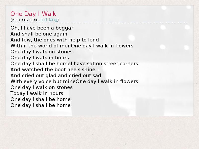Oh, I have been a beggar And shall be one again And few, the ones with help to lend Within the world of menOne day I walk in flowers One day I walk on stones One day I walk in hours One day I shall be homeI have sat on street corners And watched the boot heels shine And cried out glad and cried out sad With every voice but mineOne day I walk in flowers One day I walk on stones Today I walk in hours One day I shall be home One day I shall be home