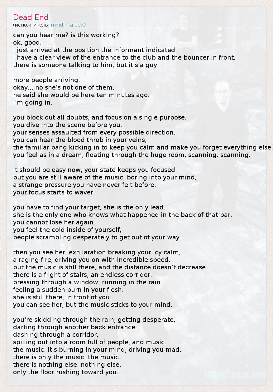 can you hear me? is this working? ok, good. I just arrived at the position the informant indicated. I have a clear view of the entrance to the club and the bouncer in front. there is someone talking to him, but it's a guy. more people arriving. okay... no she's not one of them. he said she would be here ten minutes ago. I'm going in. you block out all doubts, and focus on a single purpose. you dive into the scene before you, your senses assaulted from every possible direction. you can hear the blood throb in your veins, the familiar pang kicking in to keep you calm and make you forget everything else. you feel as in a dream, floating through the huge room, scanning. scanning. it should be easy now, your state keeps you focused. but you are still aware of the music, boring into your mind, a strange pressure you have never felt before. your focus starts to waver. you have to find your target, she is the only lead. she is the only one who knows what happened in the back of that bar. you cannot lose her again. you feel the cold inside of yourself, people scrambling desperately to get out of your way. then you see her, exhilaration breaking your icy calm, a raging fire, driving you on with incredible speed. but the music is still there, and the distance doesn't decrease. there is a flight of stairs, an endless corridor. pressing through a window, running in the rain. feeling a sudden burn in your flesh. she is still there, in front of you. you can see her, but the music sticks to your mind. you're skidding through the rain, getting desperate, darting through another back entrance. dashing through a corridor, spilling out into a room full of people, and music. the music. it's burning in your mind, driving you mad, there is only the music. the music. there is nothing else. nothing else. only the floor rushing toward you.