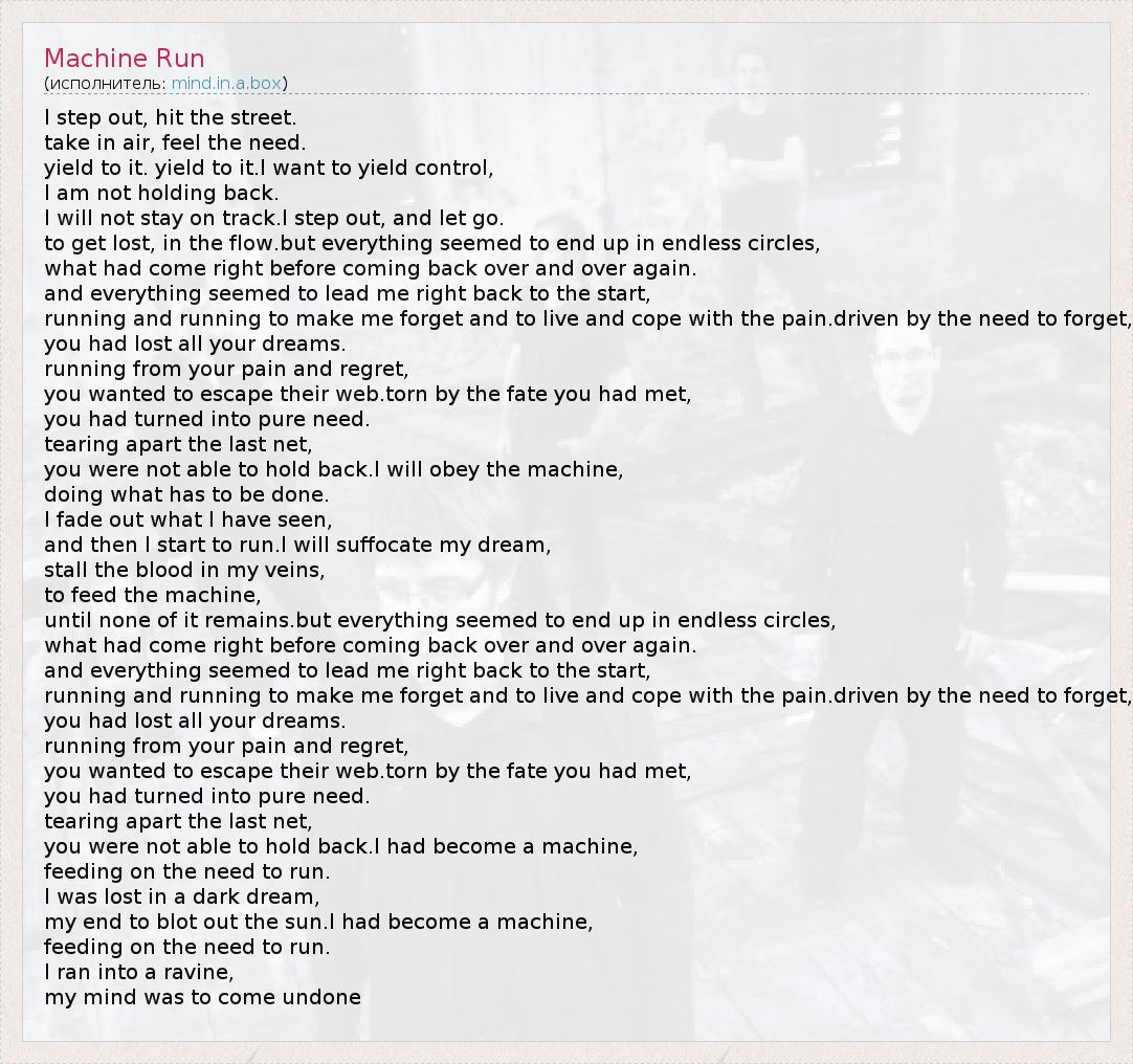 I step out, hit the street. take in air, feel the need. yield to it. yield to it.I want to yield control, I am not holding back. I will not stay on track.I step out, and let go. to get lost, in the flow.but everything seemed to end up in endless circles, what had come right before coming back over and over again. and everything seemed to lead me right back to the start, running and running to make me forget and to live and cope with the pain.driven by the need to forget, you had lost all your dreams. running from your pain and regret, you wanted to escape their web.torn by the fate you had met, you had turned into pure need. tearing apart the last net, you were not able to hold back.I will obey the machine, doing what has to be done. I fade out what I have seen, and then I start to run.I will suffocate my dream, stall the blood in my veins, to feed the machine, until none of it remains.but everything seemed to end up in endless circles, what had come right before coming back over and over again. and everything seemed to lead me right back to the start, running and running to make me forget and to live and cope with the pain.driven by the need to forget, you had lost all your dreams. running from your pain and regret, you wanted to escape their web.torn by the fate you had met, you had turned into pure need. tearing apart the last net, you were not able to hold back.I had become a machine, feeding on the need to run. I was lost in a dark dream, my end to blot out the sun.I had become a machine, feeding on the need to run. I ran into a ravine, my mind was to come undone