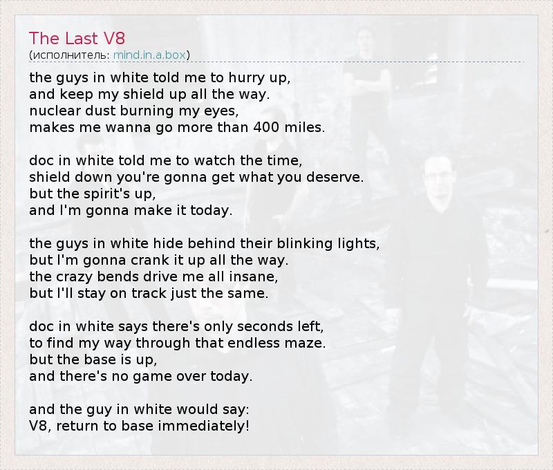 the guys in white told me to hurry up, and keep my shield up all the way. nuclear dust burning my eyes, makes me wanna go more than 400 miles. doc in white told me to watch the time, shield down you're gonna get what you deserve. but the spirit's up, and I'm gonna make it today. the guys in white hide behind their blinking lights, but I'm gonna crank it up all the way. the crazy bends drive me all insane, but I'll stay on track just the same. doc in white says there's only seconds left, to find my way through that endless maze. but the base is up, and there's no game over today. and the guy in white would say: V8, return to base immediately!