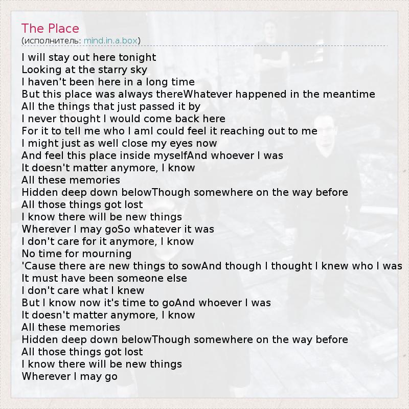Это интересно:В мире mind.in.a.box разум людей находится в заключении, и чаще всего они этого даже не осознают. mind.in.a.box - это метафора обозначающая все то, что мешает нашему разуму быть действительно свободным, начиная от повседневной рутины и заканчивая фундаментальным чувством одиночества, которое появляется у нас из-за нарастающего эгоизма окружающих.Песни mind.in.a.box - это истории этого мира, основанные... продолжение
