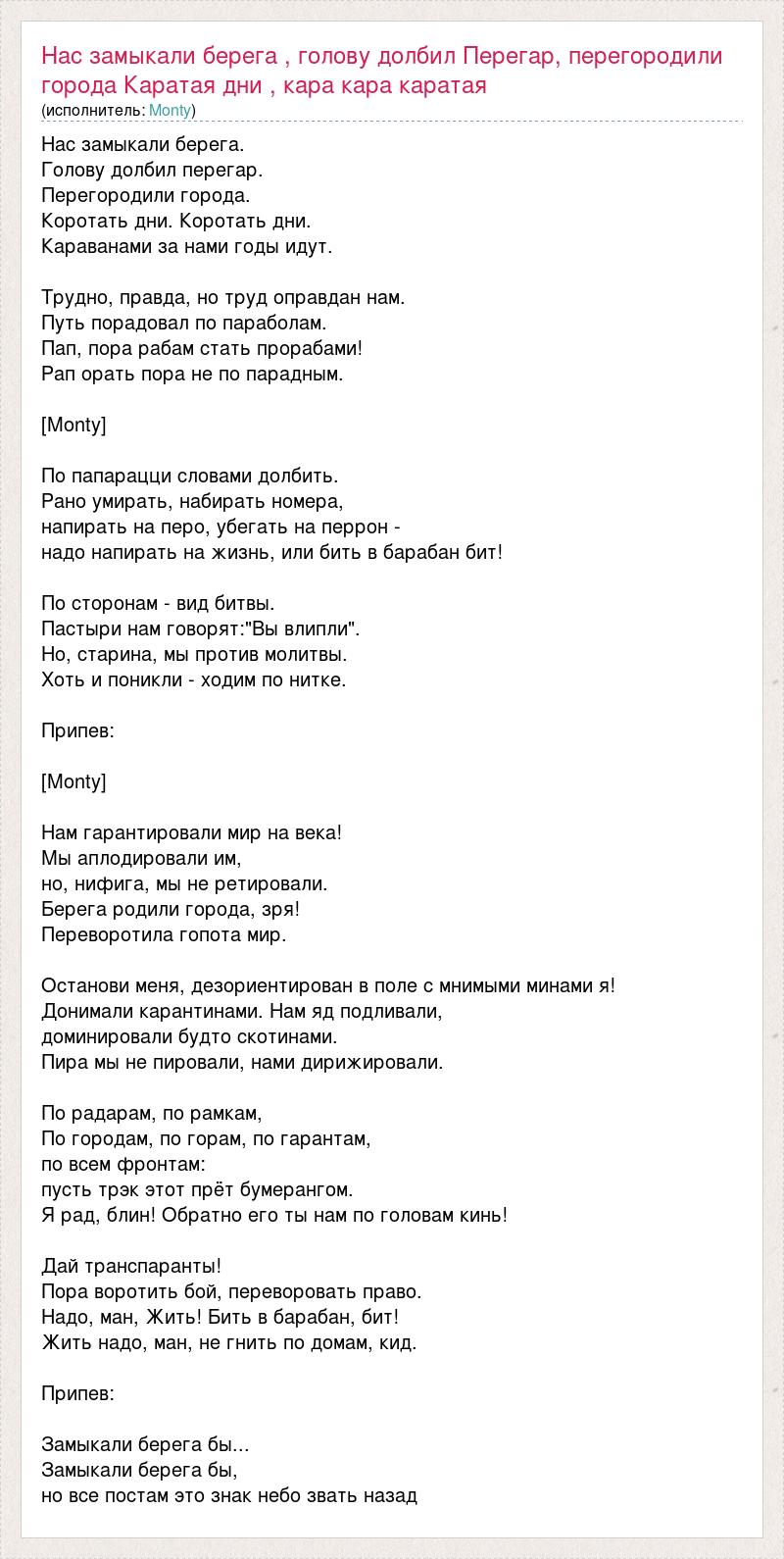 Нас замыкали берега. Голову долбил перегар. Перегородили города. Коротать дни. Коротать дни. Караванами за нами годы идут. Трудно, правда, но труд оправдан нам. Путь порадовал по параболам. Пап, пора рабам стать прорабами! Рап орать пора не по парадным. [Monty] По папарацци словами долбить. Рано умирать, набирать номера, напирать на перо, убегать на перрон - надо напирать на жизнь, или бить в барабан бит! По сторонам - вид битвы. Пастыри нам говорят:"Вы влипли". Но, старина, мы против молитвы. Хоть и поникли - ходим по нитке. Припев: [Monty] Нам гарантировали мир на века! Мы аплодировали им, но, нифига, мы не ретировали. Берега родили города, зря! Переворотила гопота мир. Останови меня, дезориентирован в поле с мнимыми минами я! Донимали карантинами. Нам яд подливали, доминировали будто скотинами. Пира мы не пировали, нами дирижировали. По радарам, по рамкам, По городам, по горам, по гарантам, по всем фронтам: пусть трэк этот прёт бумерангом. Я рад, блин! Обратно его ты нам по головам кинь! Дай транспаранты! Пора воротить бой, переворовать право. Надо, ман, Жить! Бить в барабан, бит! Жить надо, ман, не гнить по домам, кид. Припев: Замыкали берега бы... Замыкали берега бы, но все постам это знак небо звать назад