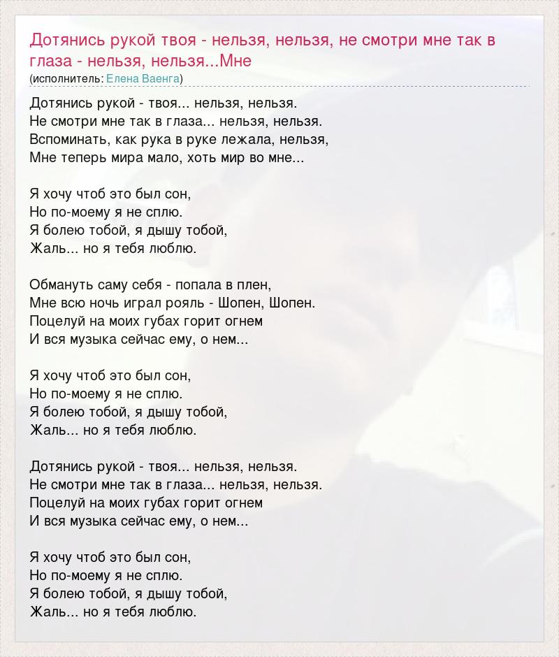 Дотянись рукой - твоя... нельзя, нельзя. Не смотри мне так в глаза... нельзя, нельзя. Вспоминать, как рука в руке лежала, нельзя, Мне теперь мира мало, хоть мир во мне... Я хочу чтоб это был сон, Но по-моему я не сплю. Я болею тобой, я дышу тобой, Жаль... но я тебя люблю. Обмануть саму себя - попала в плен, Мне всю ночь играл рояль - Шопен, Шопен. Поцелуй на моих губах горит огнем И вся музыка сейчас ему, о нем... Я хочу чтоб это был сон, Но по-моему я не сплю. Я болею тобой, я дышу тобой, Жаль... но я тебя люблю. Дотянись рукой - твоя... нельзя, нельзя. Не смотри мне так в глаза... нельзя, нельзя. Поцелуй на моих губах горит огнем И вся музыка сейчас ему, о нем... Я хочу чтоб это был сон, Но по-моему я не сплю. Я болею тобой, я дышу тобой, Жаль... но я тебя люблю.
